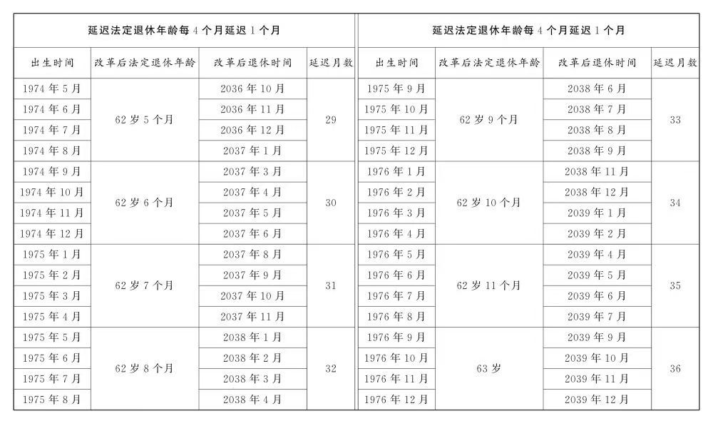 第一条 从2025年1月1日起,男职工和原法定退休年龄为五十五周岁的女职工,法定退休年龄每四个月延迟一个月,分别逐步延迟至六十三周岁和五十八周岁;原法定退休年龄为五十周岁的女职工,法定退休年龄每二个月延迟一个月,逐步延迟至五十五周岁。国家另有规定的,从其规定。