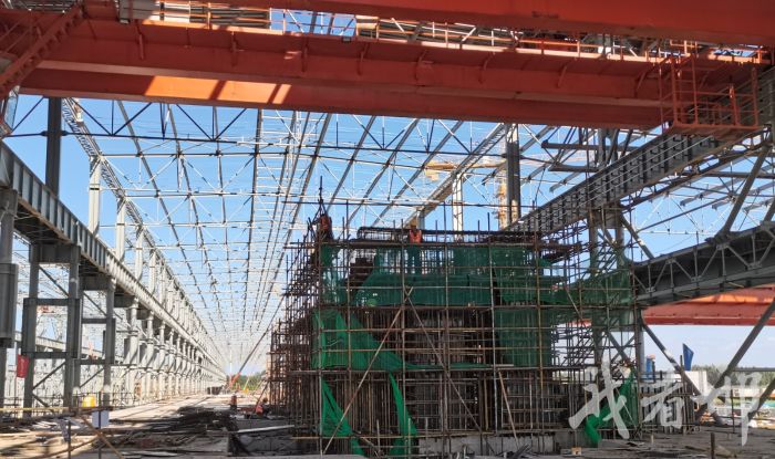 走在项目现场,随处可见矗立的钢结构和封顶的建筑主体。项目主要部分从西向东分别是炼铁区域、炼钢区域和轧钢区域,项目钢结构工程已全面铺开。