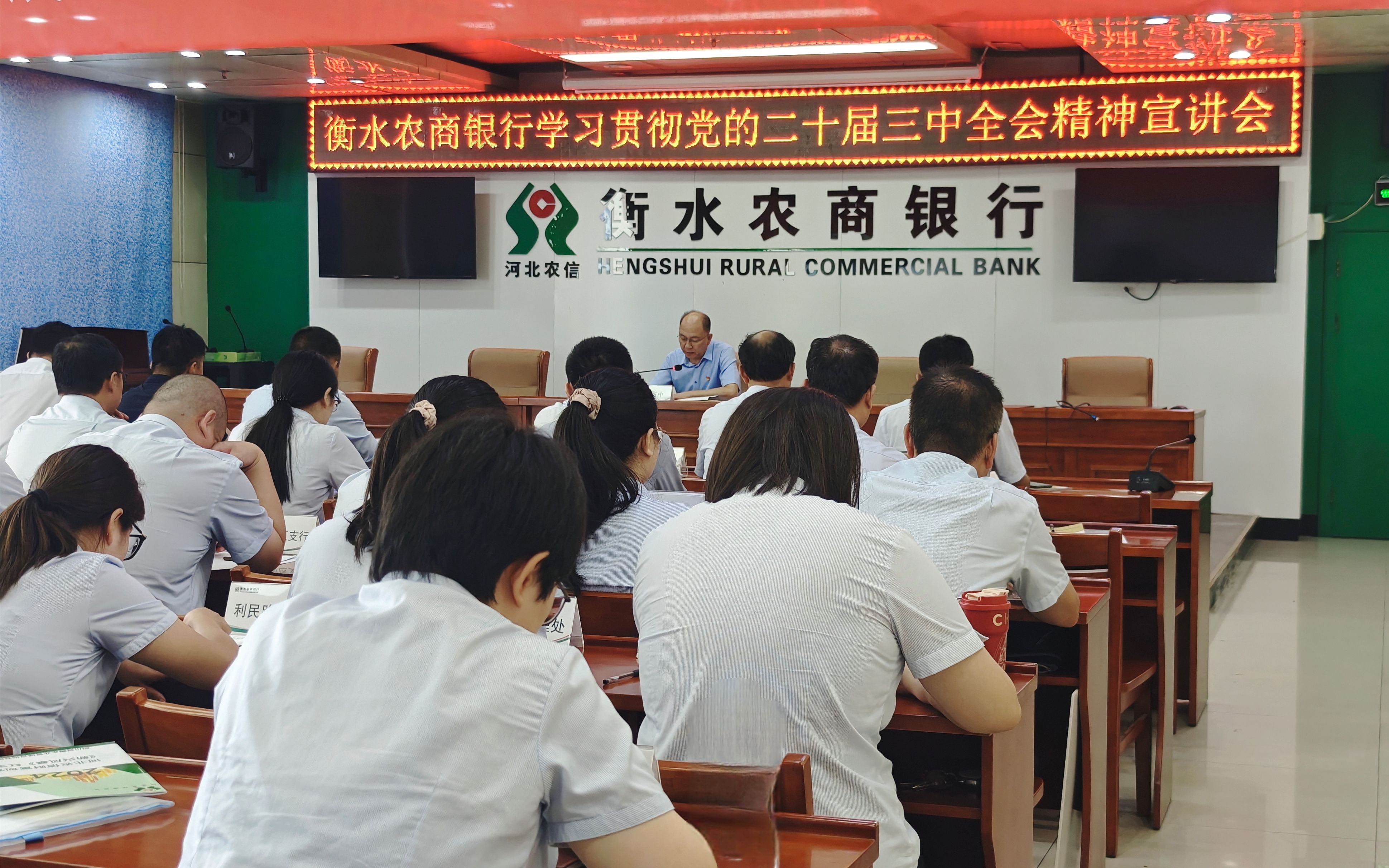 党的二十届三中全会召开以来,衡水农商银行把学习宣传贯彻党的二十届三中全会精神作为当前和今后一个时期的一项重大政治任务,组织全行深入学习领会全会精神,切实把思想和行动统一到习近平总书记重要讲话和全会精神上来,全力以赴在金融服务经济高质量、深化自身改革转型、防范化解金融风险上取得新成效。