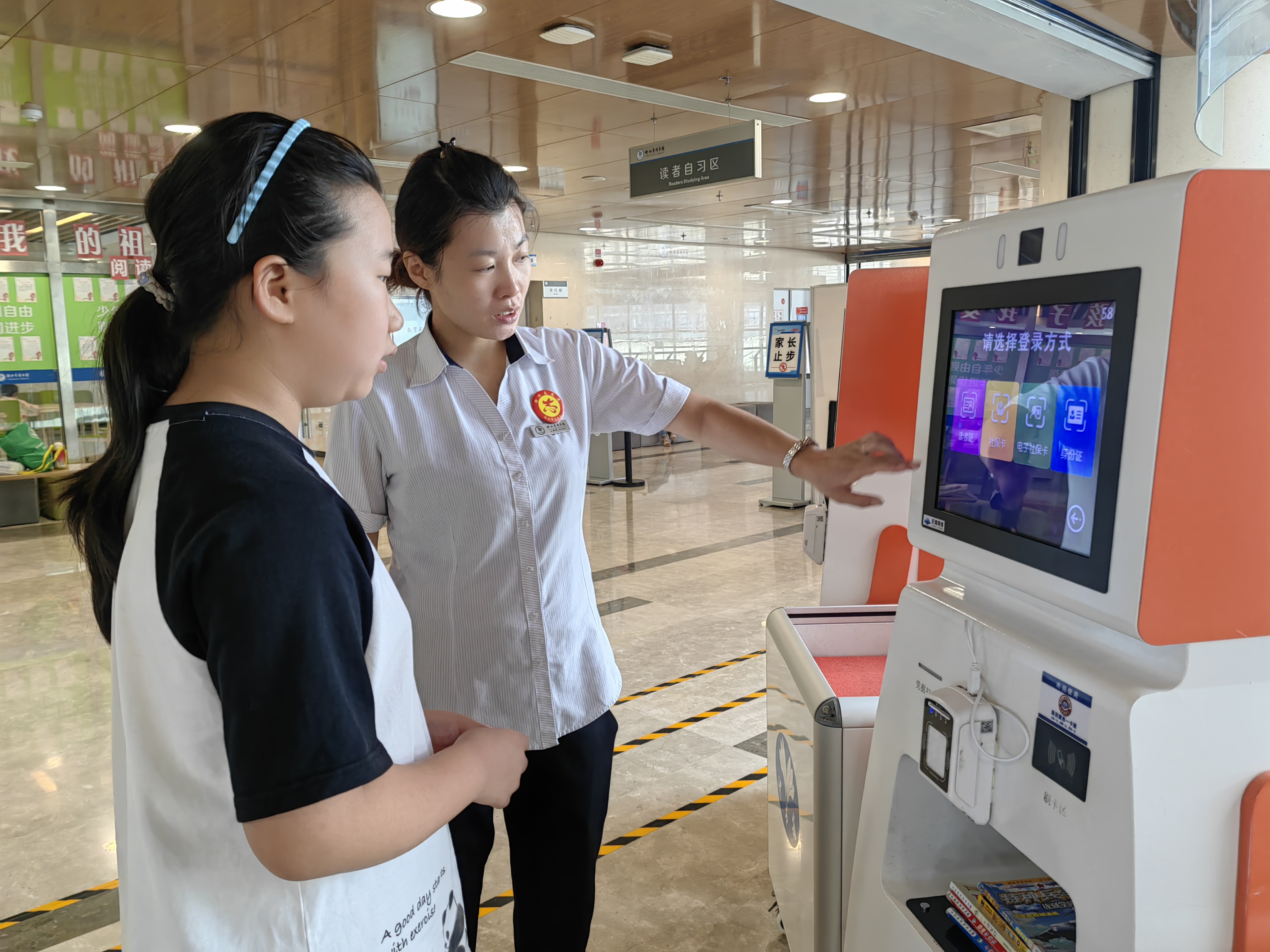 “阿姨,这个还书机为什么还不了,是不是我操作不对啊?”一个大约 10 岁的小女孩满脸困惑地找到路哓燕。路哓燕闻声,迅速来到还书机前。她微微蹲下身子,与小女孩平视,眼神中充满了耐心和关爱。“别着急,小朋友。你看,先把书放在这里,然后按照这个步骤……”她一边轻声细语地讲解,一边亲自示范操作。小女孩在她的耐心指导下,很快掌握了正确的还书方法,脸上露出了开心的笑容。
