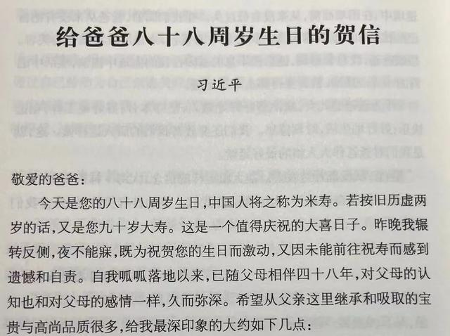 习近平给父亲习仲勋88周岁生日的贺信。(图源:《习仲勋纪念文集》)