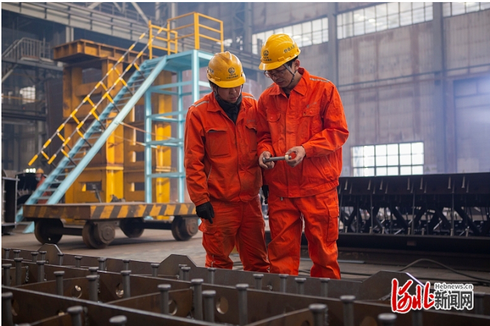 近日,中铁山桥集团有限公司焊工特级技师张明(右)和工友正在对钢构件进行分析,为焊接做准备。河北日报通讯员 董海岩摄