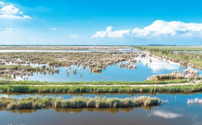 蓝天白云下的南大港湿地。