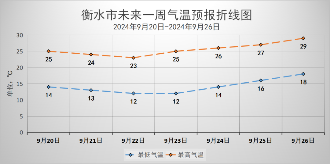 具体天气预报为:9月20日,阴有小雨,东北风4-5级,阵风6-7级,气温:25到14℃;9月21日,多云转晴,气温:24到13℃;9月22日,晴,气温:23到12℃;9月23日,晴间多云,气温:25到12℃;9月24日,晴间多云,气温:26到14℃;9月25日,晴转多云,气温:27到16℃;9月26日,多云转阴,气温:29到18℃。