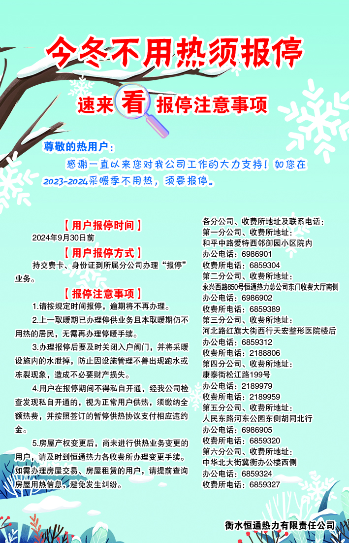 近日,记者在衡水恒通热力有限责任公司获悉,今年冬季住户若不用热,则必须在限期内报停,逾期将不再办理。这个冬天打算停暖的小伙伴们,一定要抓紧时间办理呦!