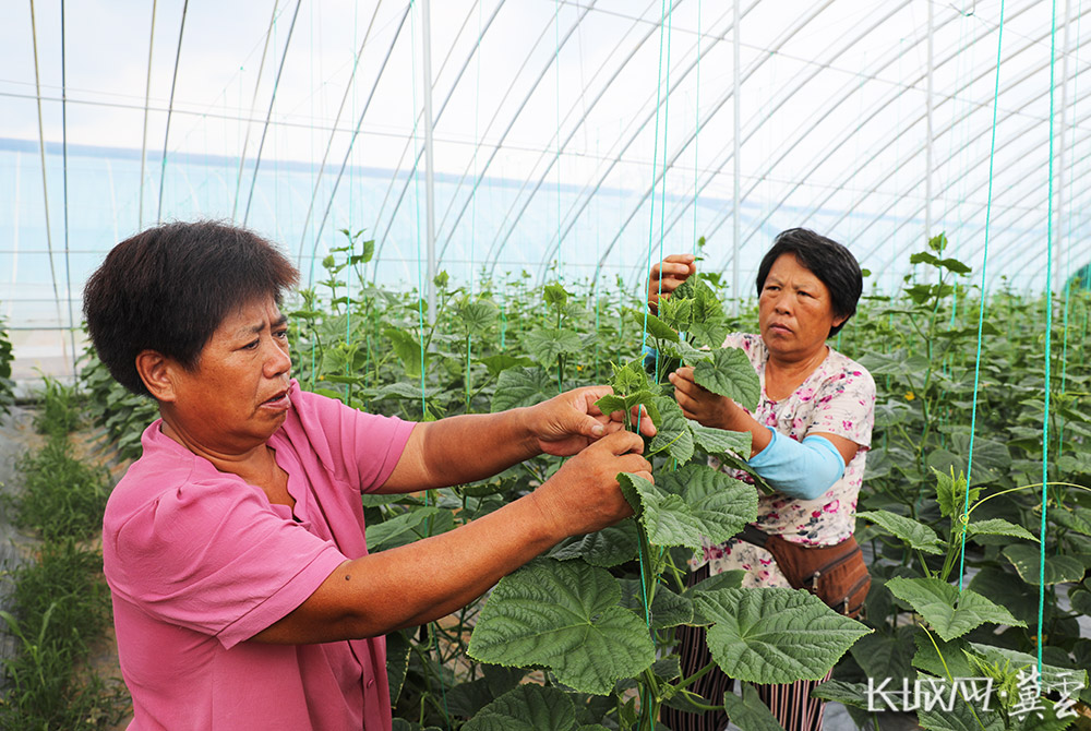 果蔬大棚内,工作人员正在打理黄瓜藤蔓。长城网·冀云客户端记者 张梅胜 摄