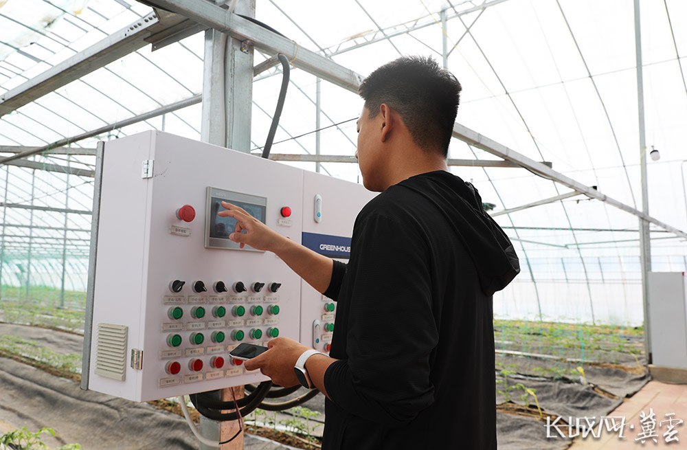 一大早,园区工作人员张佳鑫便来到基地忙着给番茄秧苗浇水。“蔬菜长得好,多亏大棚里的‘黑科技’。”张佳鑫一边说着,一边按下大棚内的绿色按键,喷淋设备自动启动,细密的水珠从喷头均匀地喷淋出来,番茄苗显得越发翠绿。
