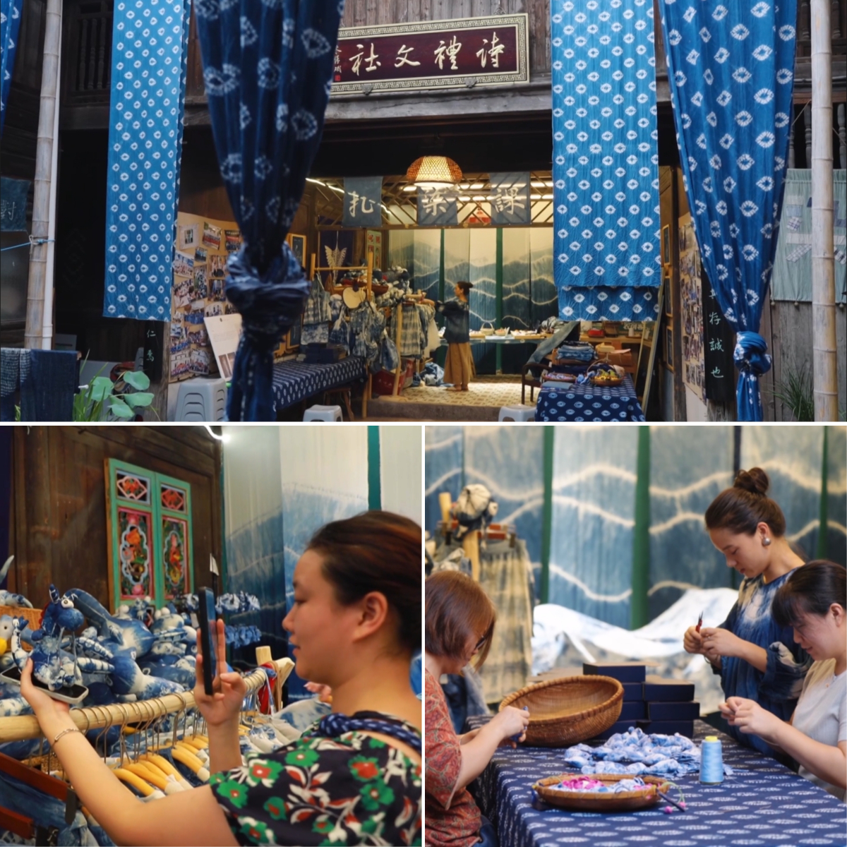 尽管她把家里的三姑六婆都找来帮忙,印染手作依然供不应求。等不及的游客们甚至自己动手,客串起了“伙计”。