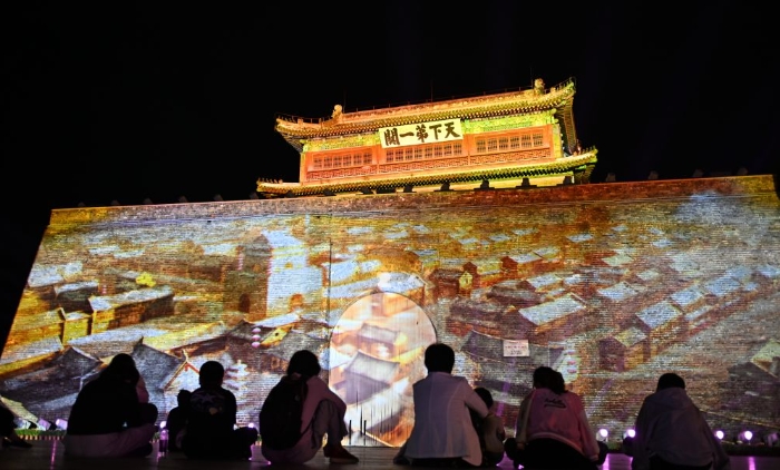 9月18日,游客在秦皇岛市山海关区“天下第一关”景区观赏灯光秀。新华社记者 牟宇 摄
