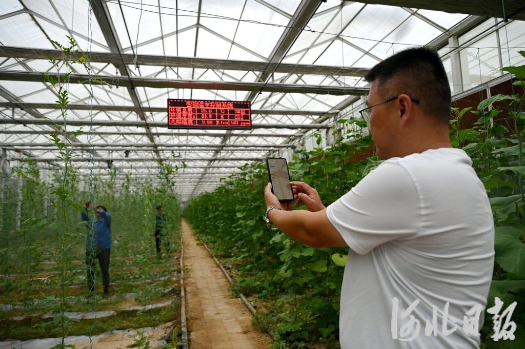 9月20日,河北绿园生态庄园农业开发有限公司管理员通过手机控制保温帘,调控智能日光温室的温度。焦磊摄