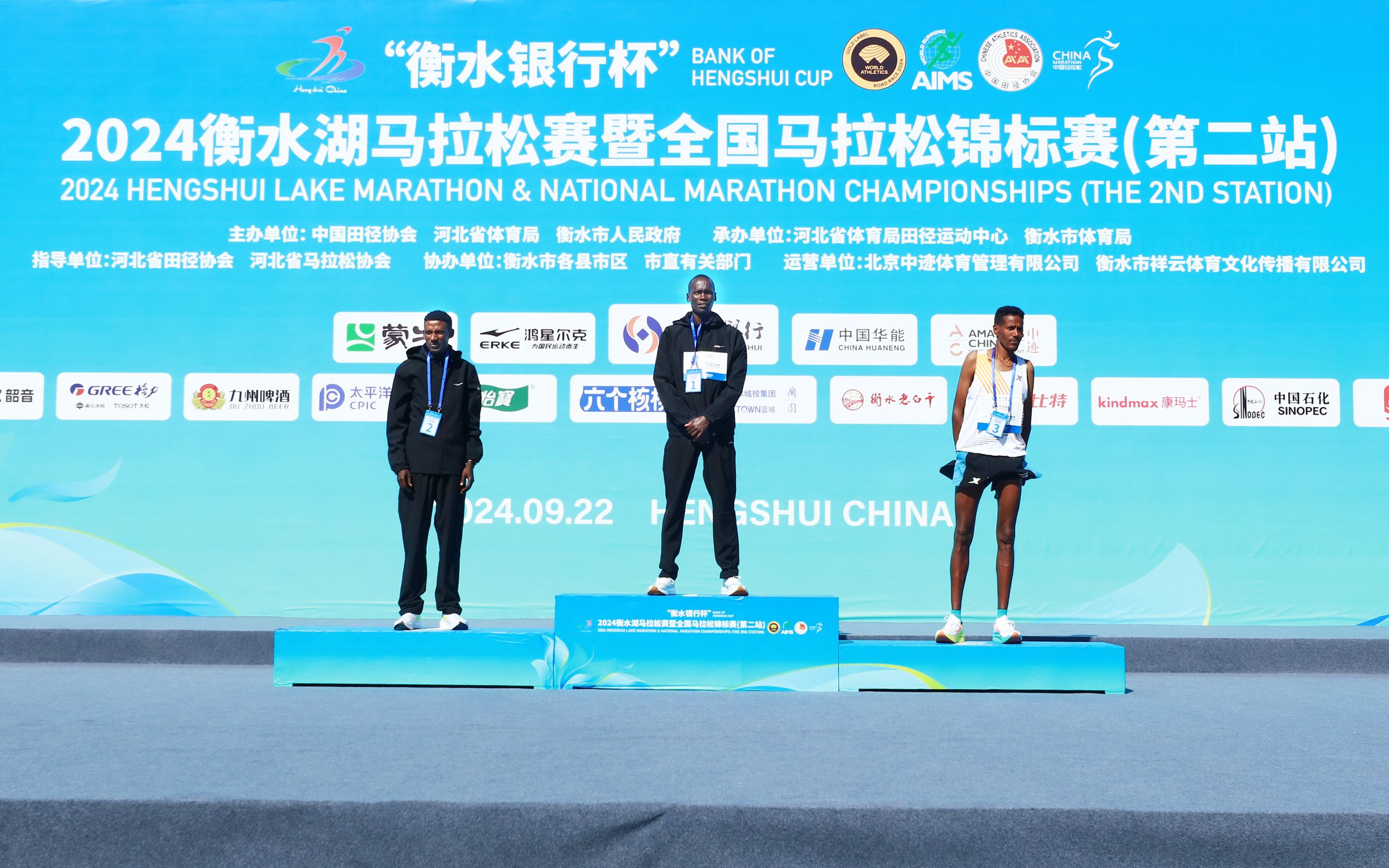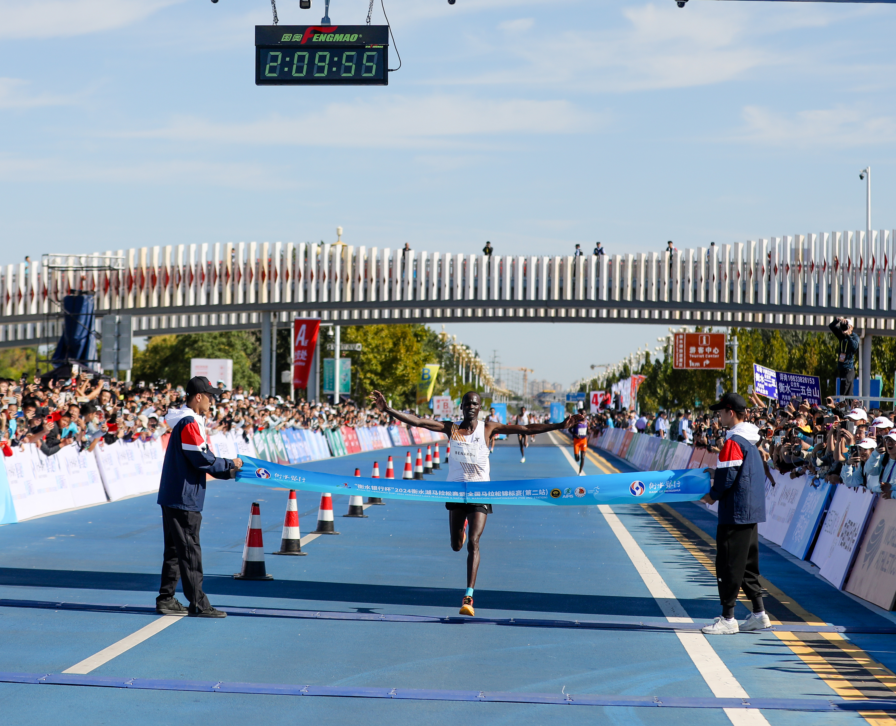 9月22日,在2024衡水湖马拉松赛上,经过两个多小时的激烈角逐,来自肯尼亚的贝纳德·基普科里尔以2小时09分57秒的成绩夺得衡水湖马拉松赛男子组冠军。