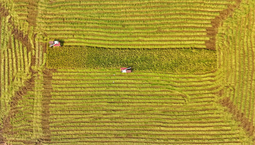 2024年8月22日,收割机在永丰村高标准农田内收割水稻(无人机照片)。团队预计,2024年永丰村高标准农田平均亩产将接近800公斤。