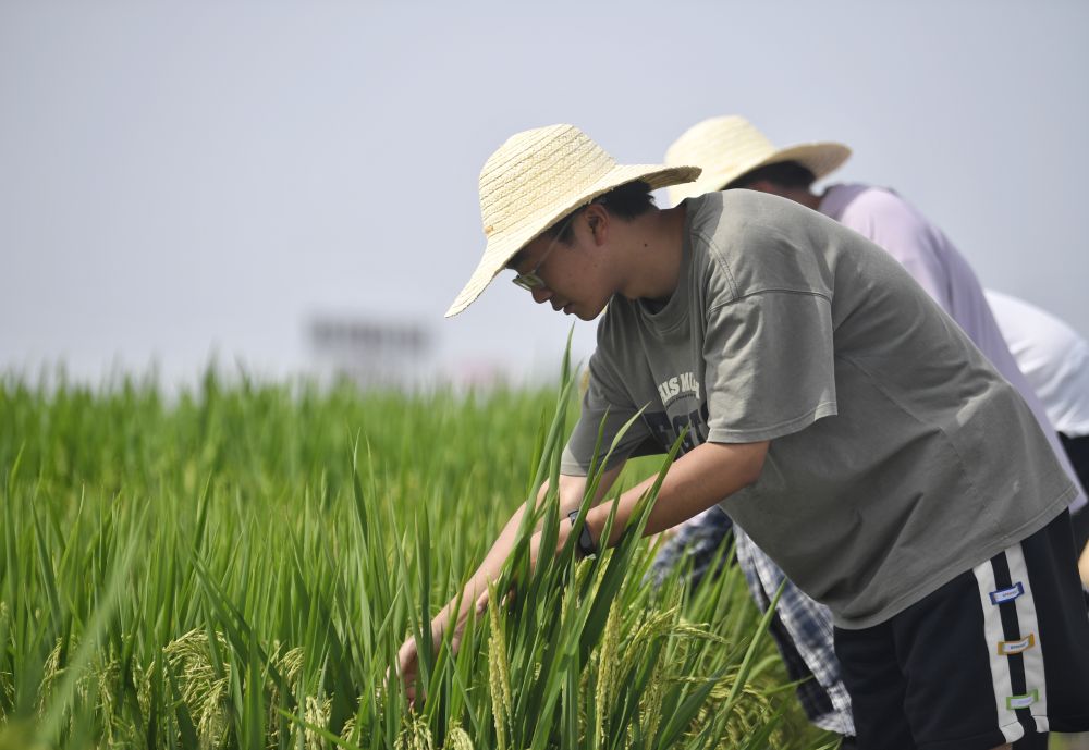 2024年7月26日,长期在永丰村高标准农田驻守的四川农业大学学生在田间观察水稻生长情况。