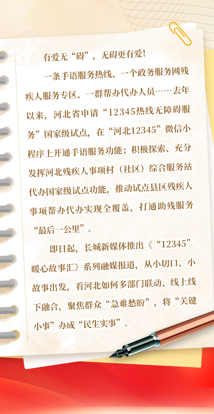 据了解,2023年9月28日,河北省数政局与河北省残联共同向中国残联申报“12345热线无障碍服务”国家试点获批。截至9月24日,全省“12345热线手语服务”专席累计受理办理听障人士诉求160余件次。