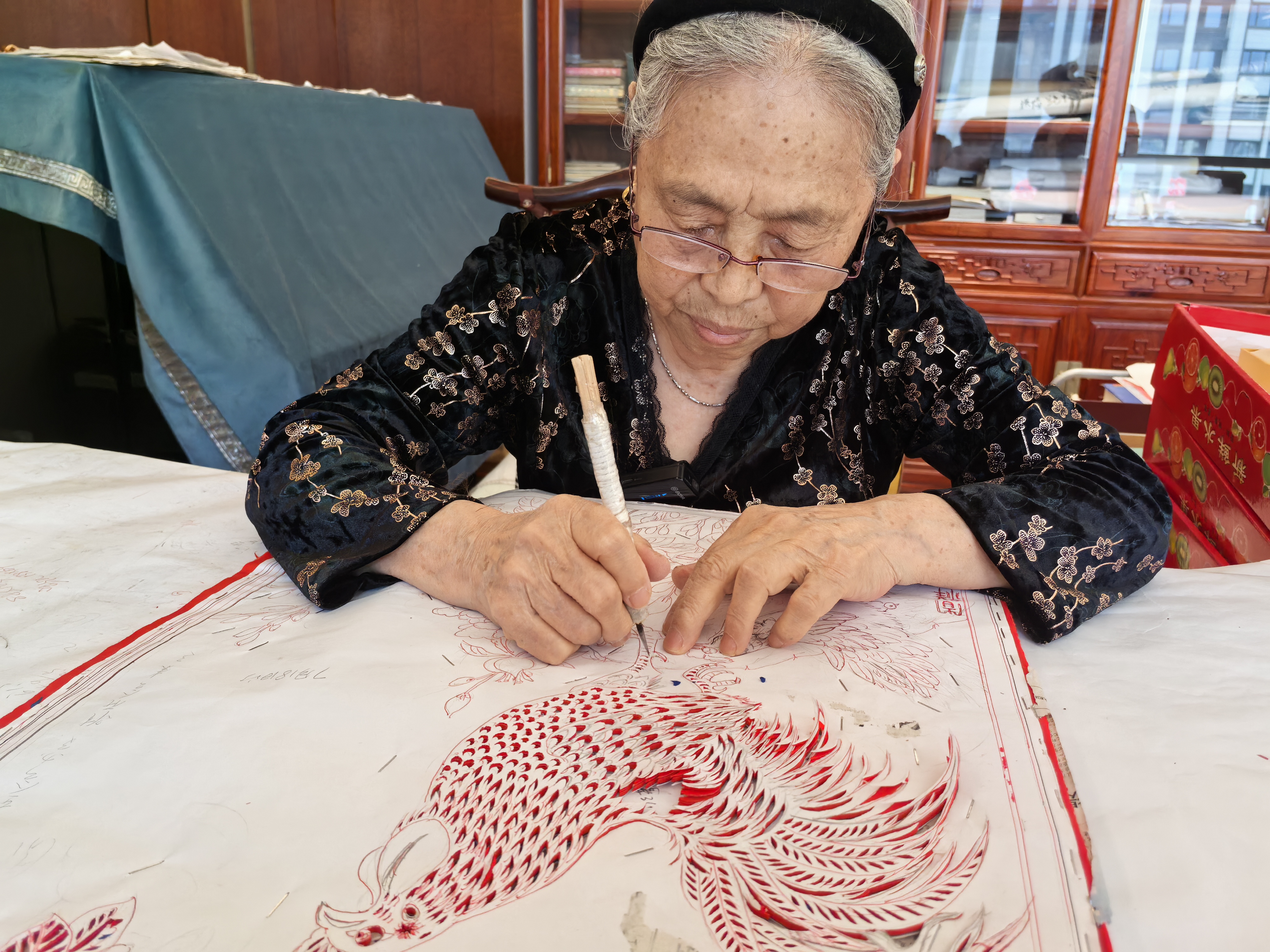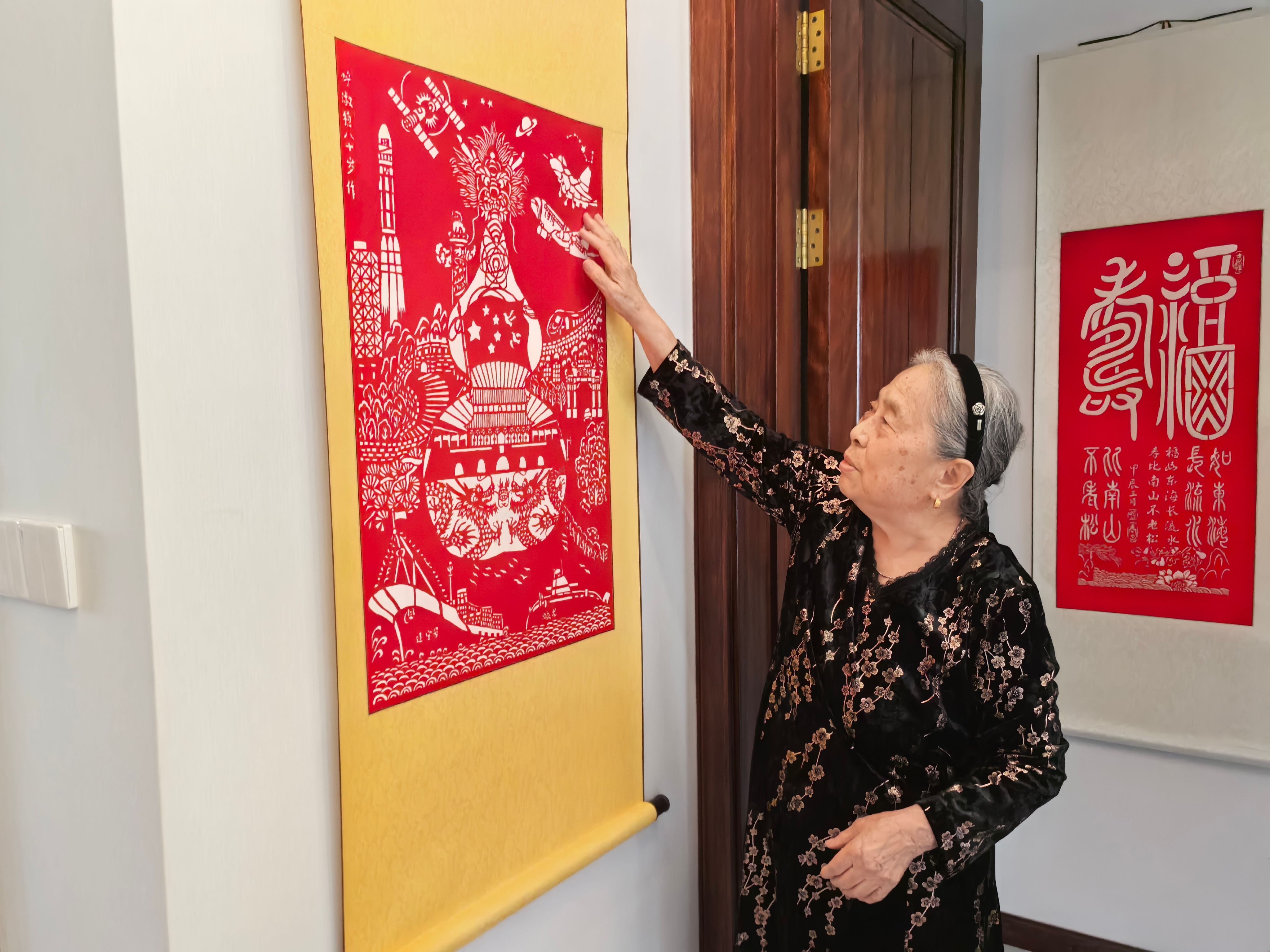 今年是中华人民共和国成立75周年,从6月份起,老人就着手设计一幅大型剪纸作品。中间的葫芦代表祝福,四周有牡丹,有和平鸽......同为党员的老伴儿也提出了不少建议。现在国家越来越强大了,高铁都修到了咱家门口,思虑再三,作品中又增加了奔驰在华夏大地的“复兴号”动车、翱翔蓝天的C919大飞机、威风凛凛的辽宁舰等元素。“看到祖国日新月异的变化,我打心眼儿里高兴啊!”呼淑稳老人说,“我愿意一直用剪纸,歌颂现在的美好生活。”