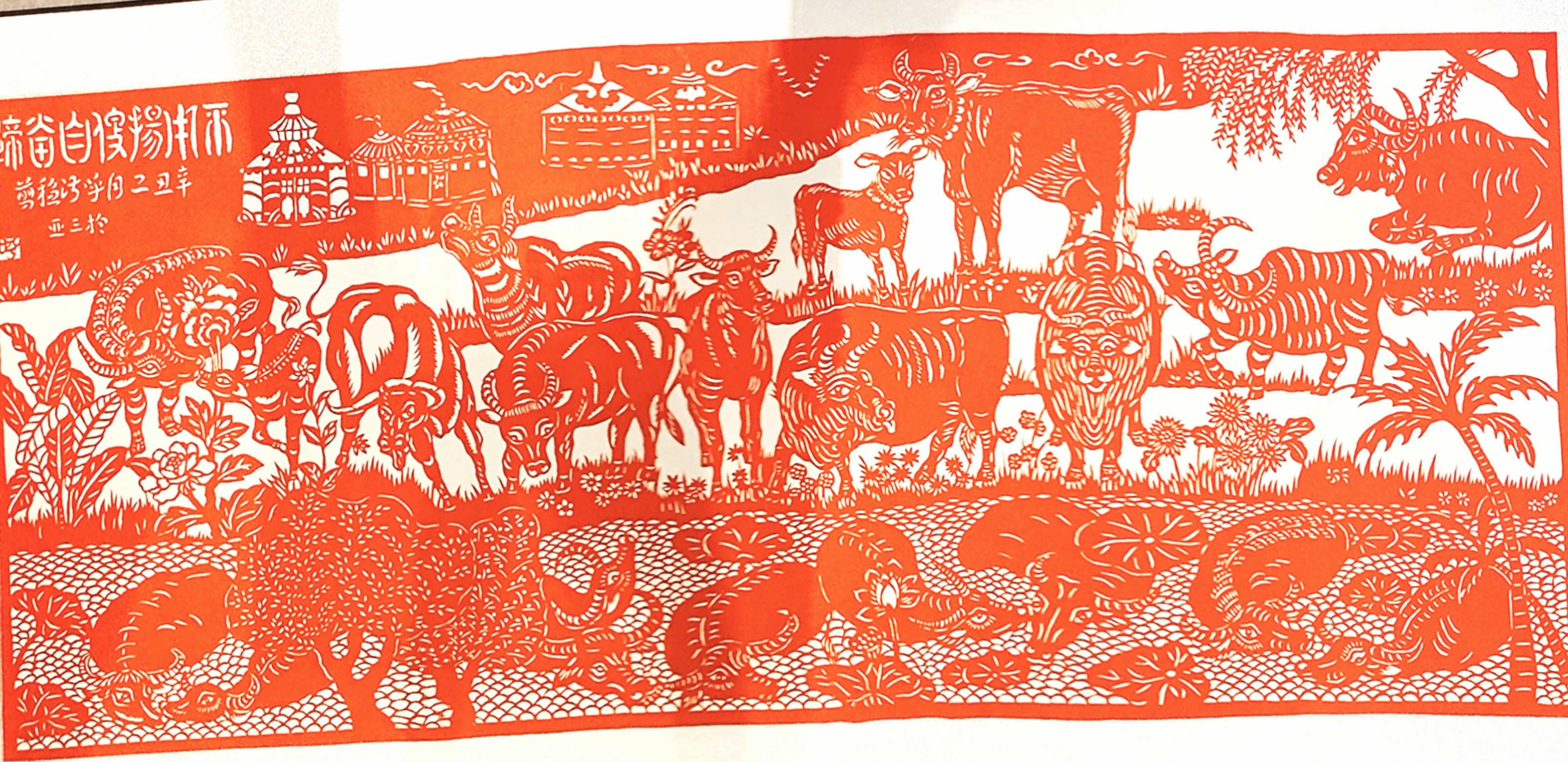 剪纸30余年,老人早已把自己的情感与手中的剪纸融为了一体。2021年,恰逢中国共产党成立一百周年,作为一名拥有50多年党龄的老党员,呼淑稳内心非常激动。“我去海南,看到水牛在田中安详的吃草,回家路上,又看到一望无际的平原上,有农民牵着黄牛走过。我一下子就把这些‘镜头’联系了起来。”翻着手中的作品,呼淑稳向记者介绍起题为“不用扬鞭自奋蹄”的剪纸,一米多长的作品,囊括了水牛、黄牛、奶牛等21头形态各异又栩栩如生的牛,它们或低头吃草或拉犁耕地,“展示出我们国家蓬勃的生命力和满满的精气神!”回忆起这幅剪纸的初衷,老人仍很激动。