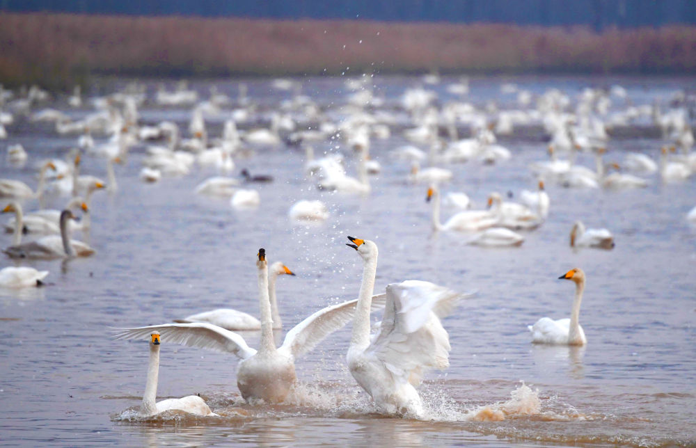 白天鹅在河南三门峡黄河湿地嬉戏。新华社记者 郝源 摄
