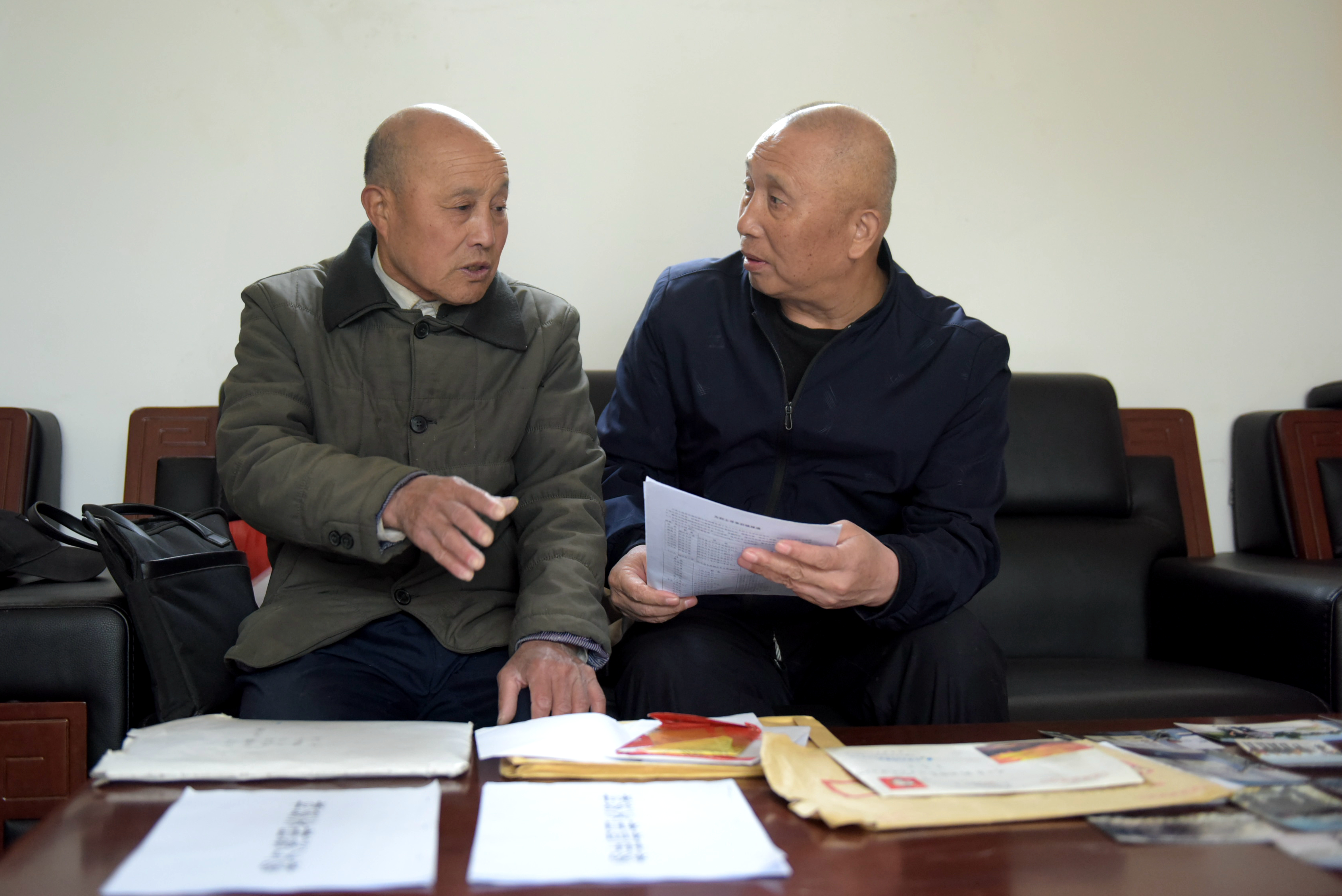 王志杰(左)与回民支队的烈士王汉杰的侄子交谈。 崔贤飞 摄