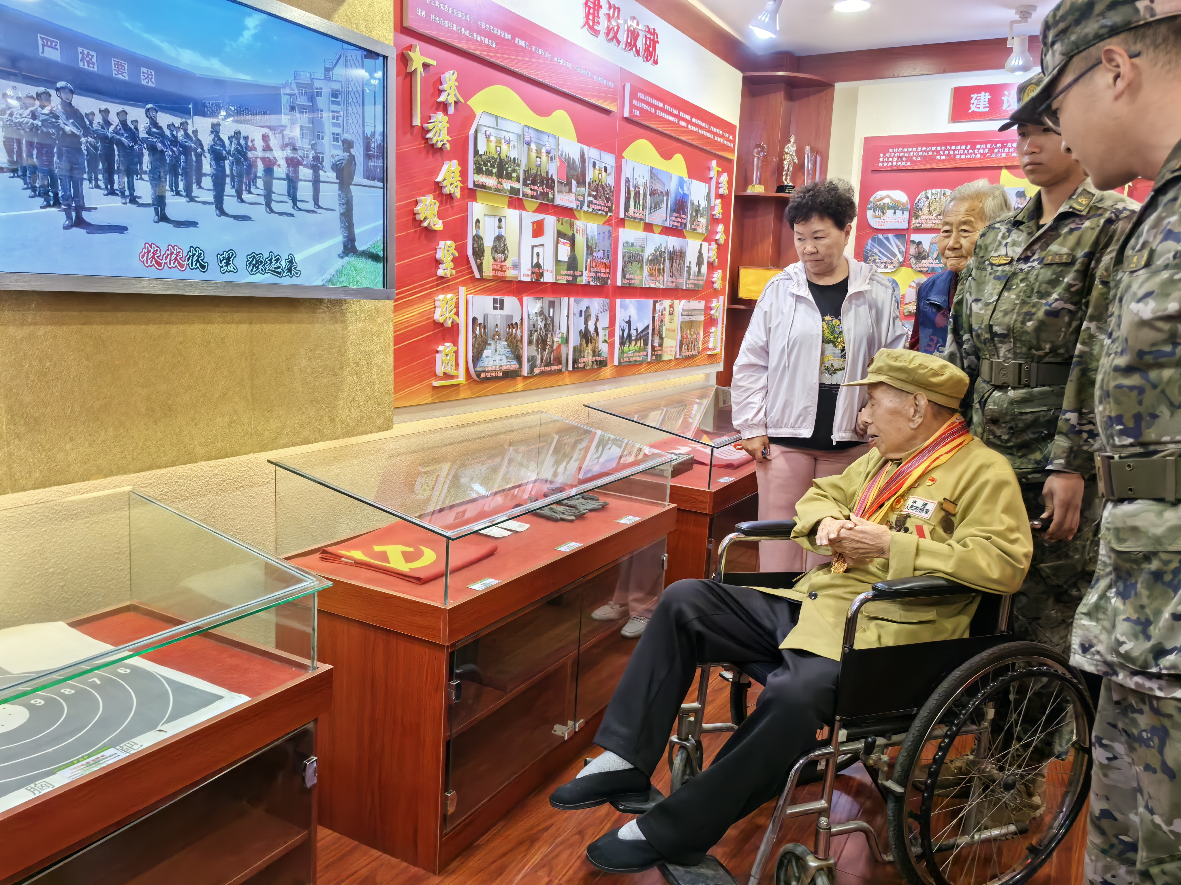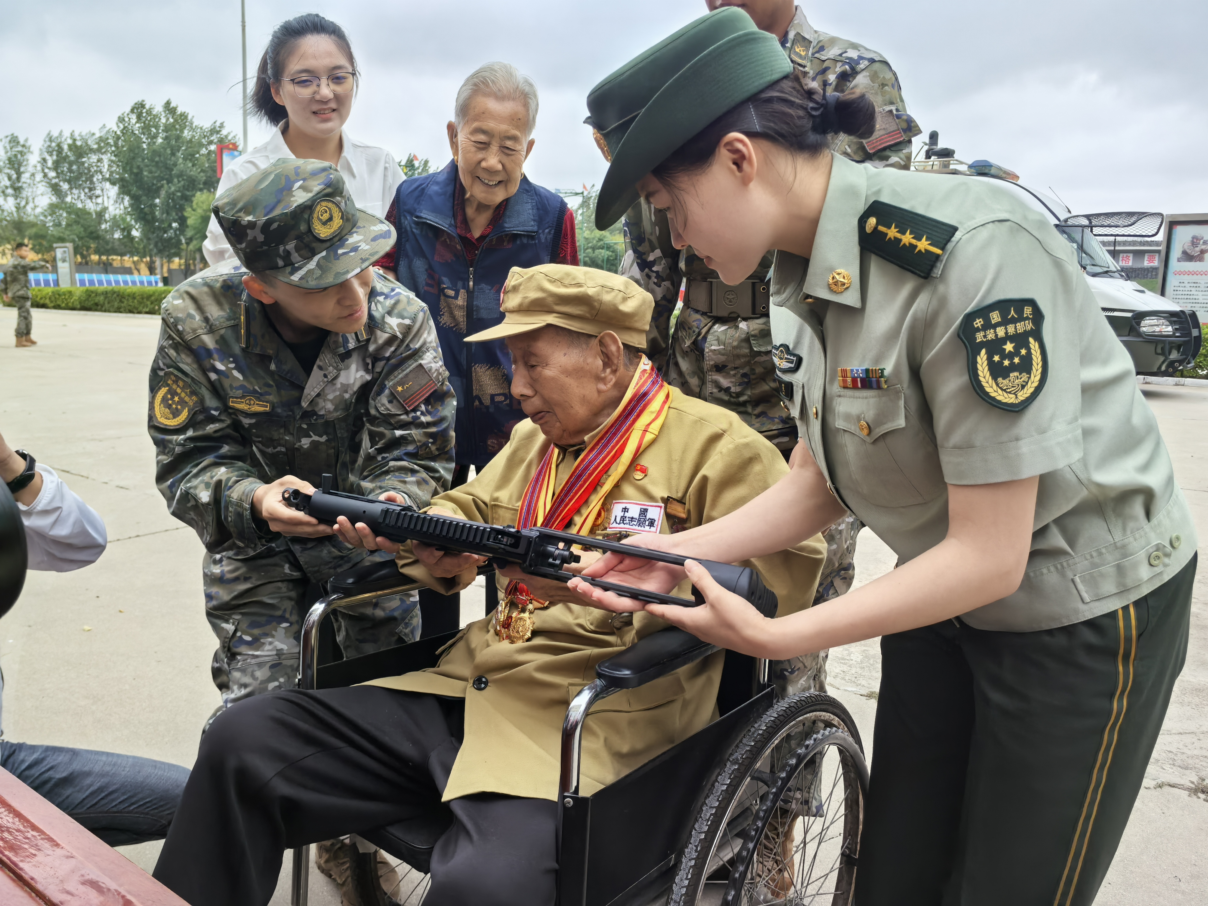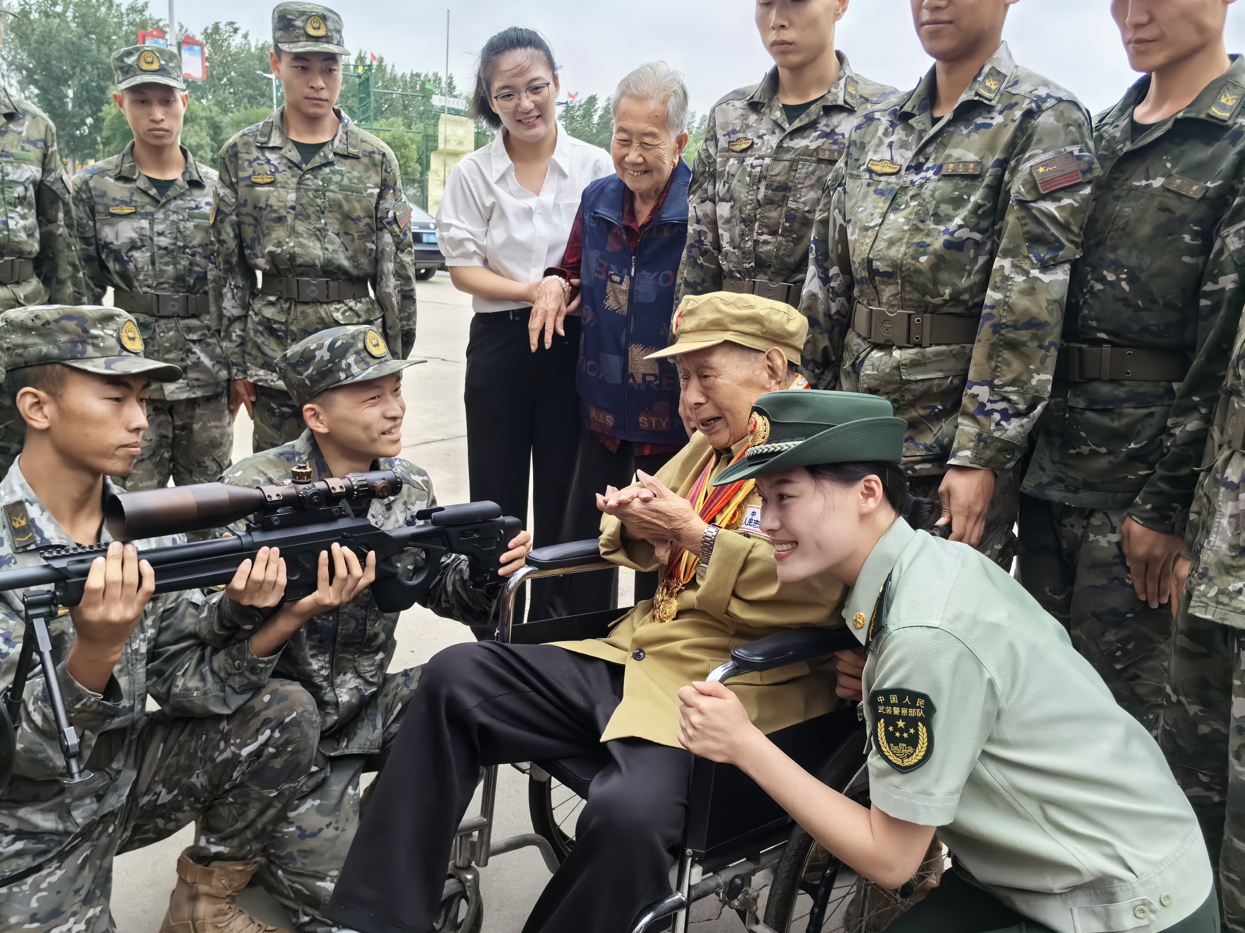 官兵们为老人现场演示了全新的枪械装备,见到满桌的新式装备,崔廷芳老人回忆起往昔峥嵘岁月,忍不住拿起枪做起瞄准动作。在官兵的带领下,崔廷芳老人还参观了营区荣誉室、班排宿舍内务卫生,重温部队生活,切身体会部队的发展变化。