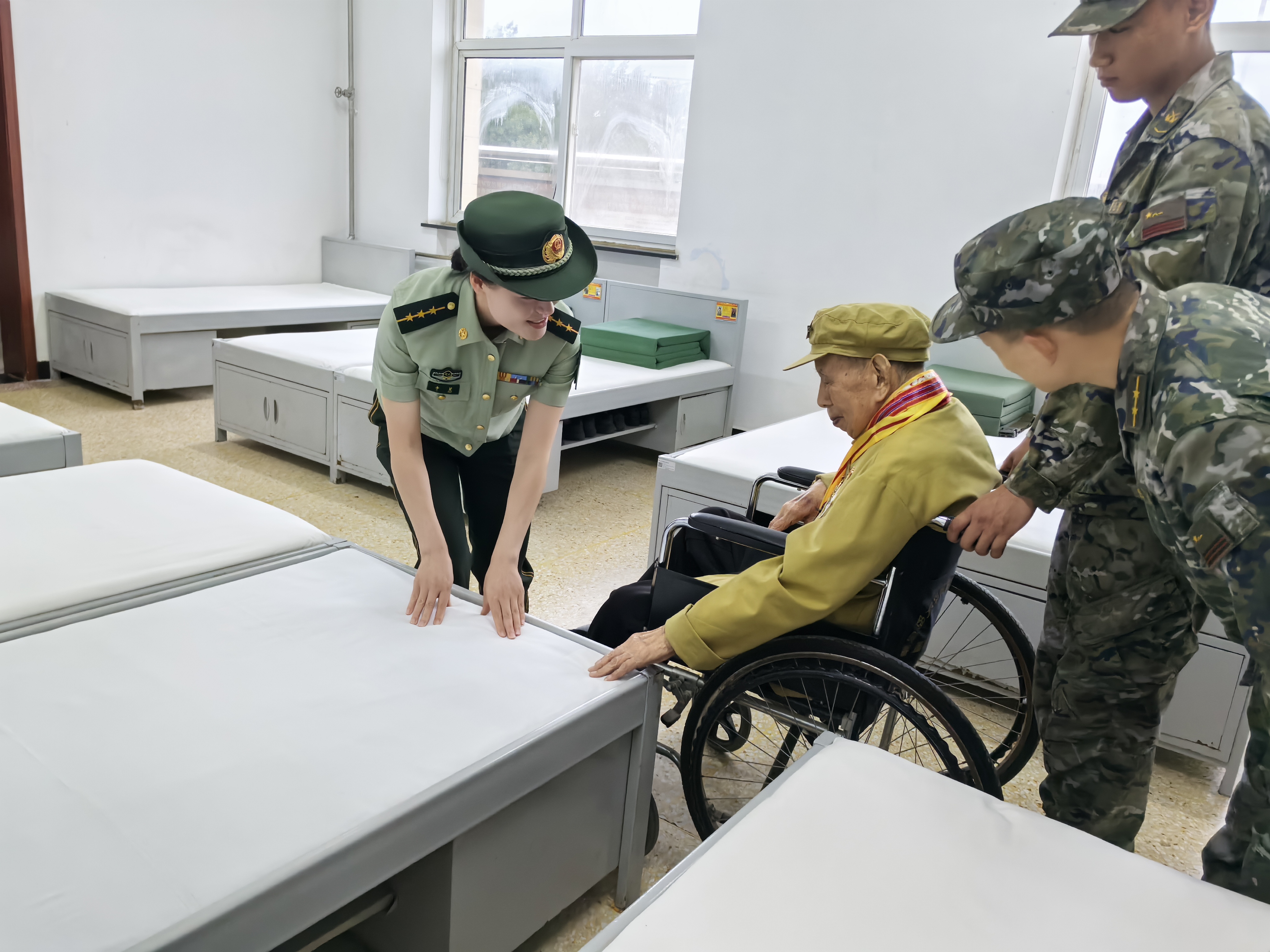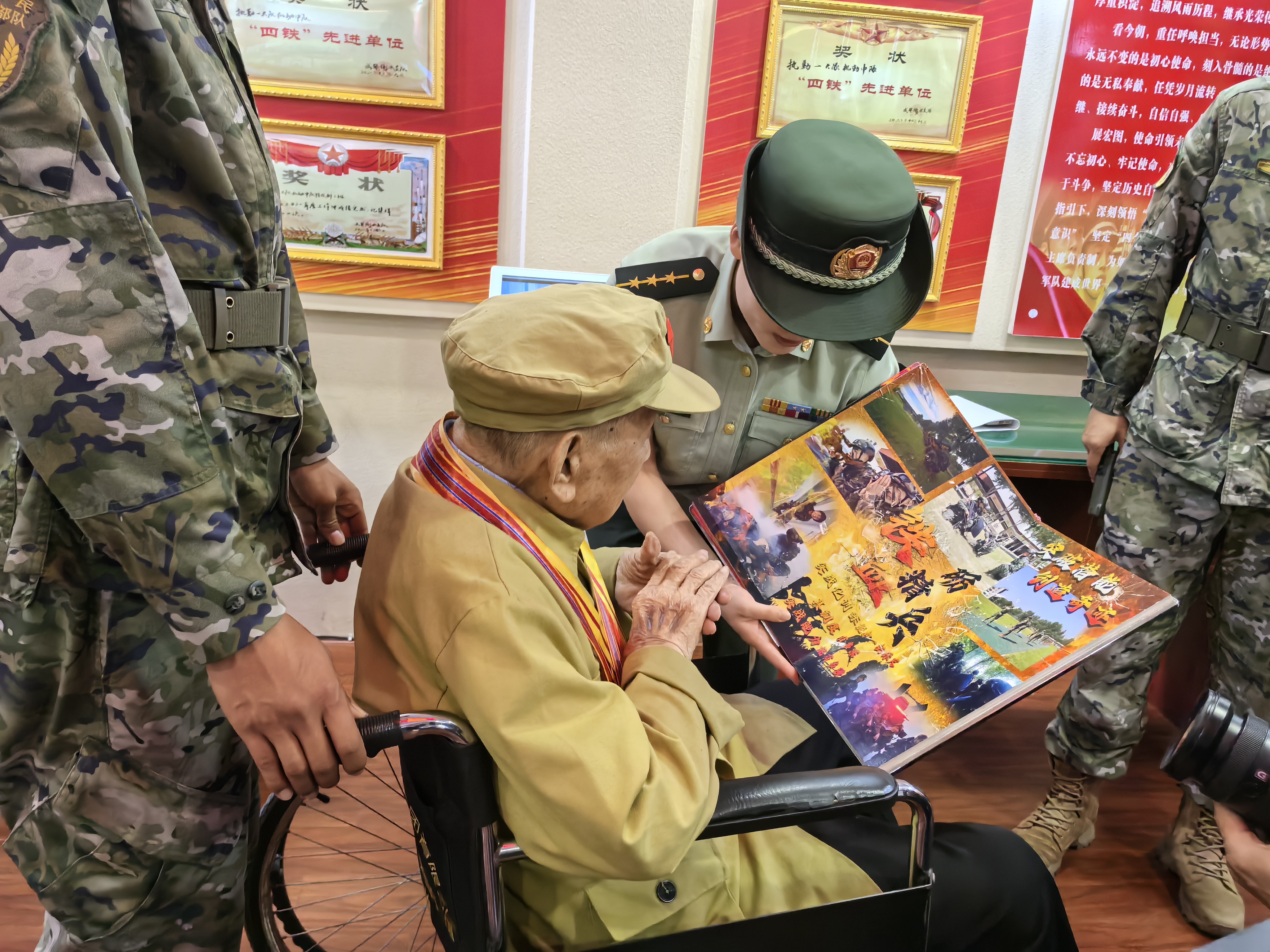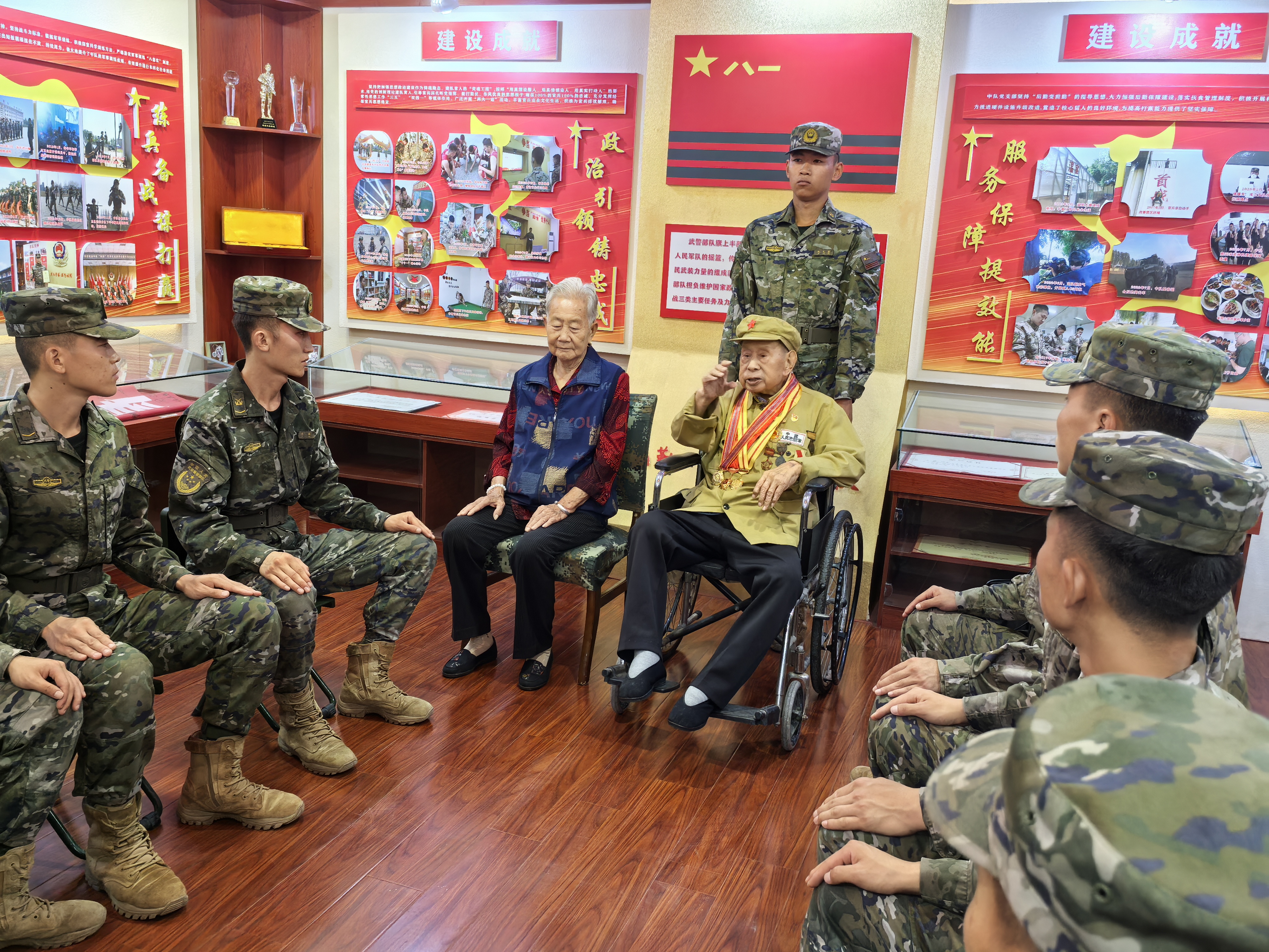 官兵们为老人现场演示了全新的枪械装备,见到满桌的新式装备,崔廷芳老人回忆起往昔峥嵘岁月,忍不住拿起枪做起瞄准动作。在官兵的带领下,崔廷芳老人还参观了营区荣誉室、班排宿舍内务卫生,重温部队生活,切身体会部队的发展变化。