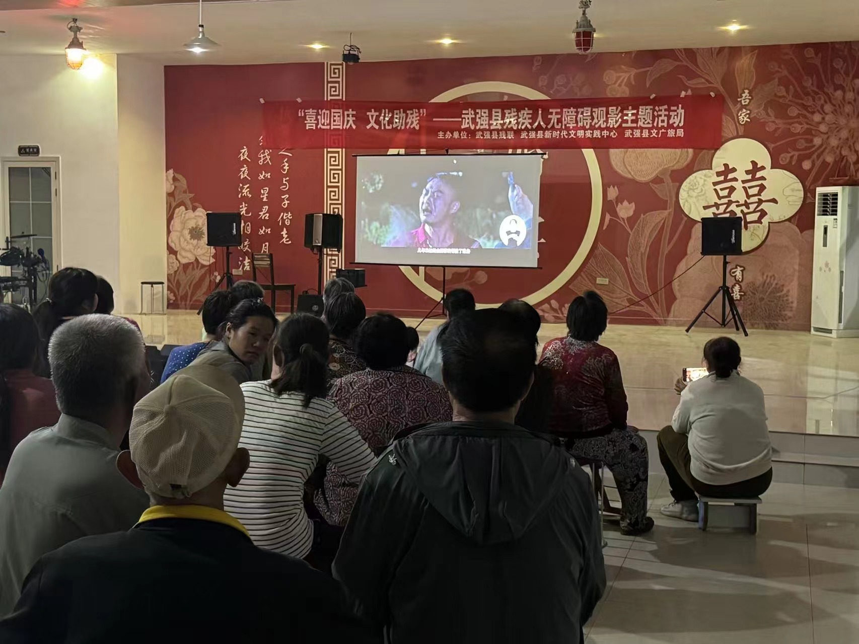 为深入学习贯彻党的二十届三中全会精神,促进残健融合,进一步丰富残疾人精神文化生活,在庆祝中华人民共和国成立75周年之际,9月27日晚,武强县残联联合武强县新时代文明实践中心、县文广旅局在武强县刘五门村文明实践站举办了武强县“迎国庆”残疾人无障碍观影主题活动,该村及附近村民40余名肢体、视听障残疾人朋友及家属参加了此次观影活动。