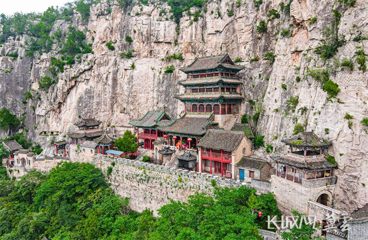 自然之美往往与文化底蕴相融合,娲皇宫便是涉县这片土地历史文化遗存最璀璨的明珠。娲皇宫坐落在凤凰山间,传说中女娲抟土造人、炼石补天的地方就在这里,距今已有一千四百多年的历史。在娲皇阁外山崖上有6部北齐时期的摩崖刻经,多达13多万字,被誉为“天下第一壁经群”。娲皇宫共有4组建筑群,建在峭壁上的是娲皇阁,是娲皇宫的主体建筑,也是最早的建筑,通高23米,由四层组成。远看娲皇阁似乎紧贴峭壁,实际上娲皇阁与山体依靠9根铁索相连,经历了十多次地震依然安然无恙。登楼远眺,太行群山涌翠,漳水如带,堪称“天造地设之境”。