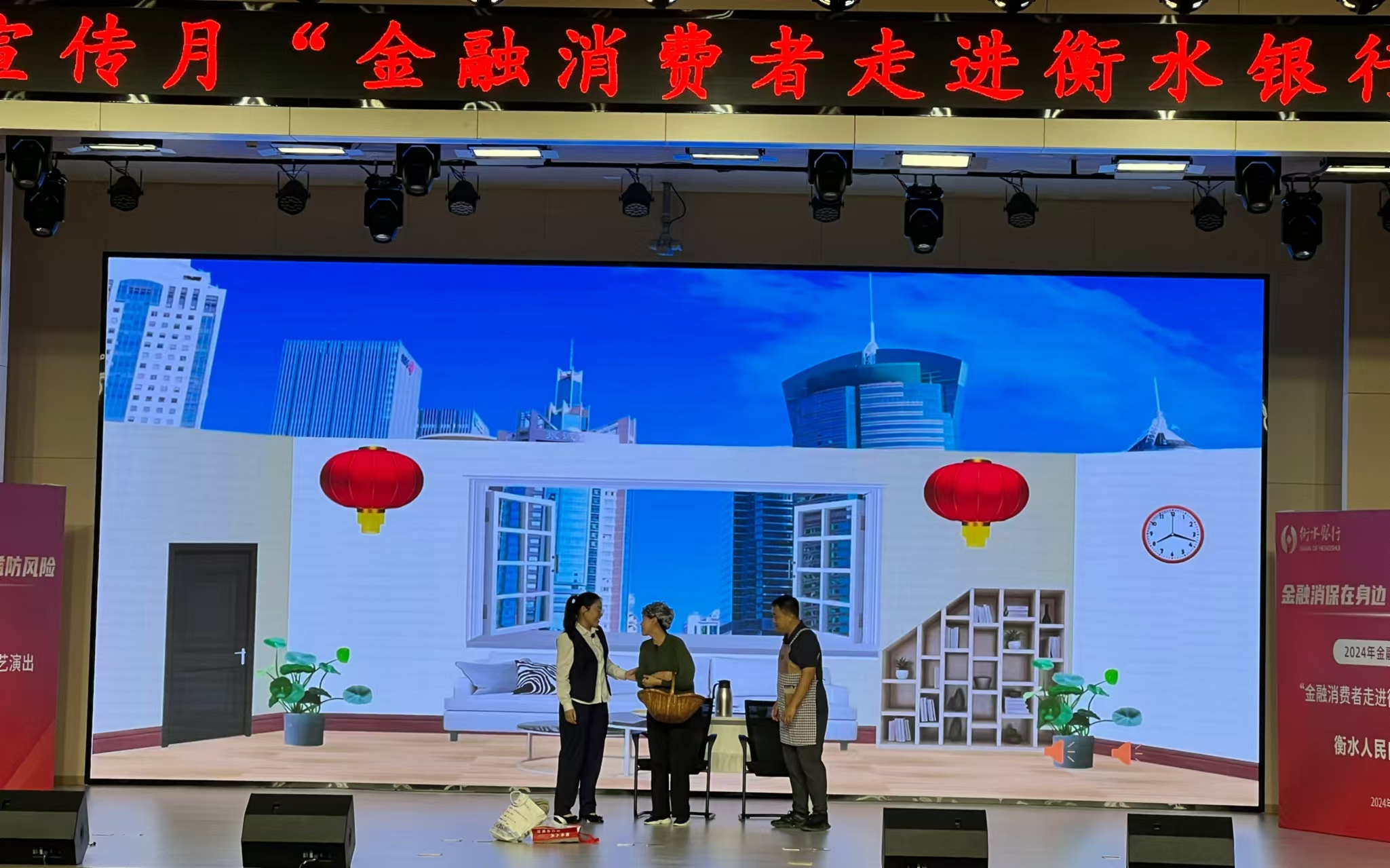下午3时,精彩的演出在欢快的开场舞中准时开始。衡水银行职工王娇、谢京彤等表演的情景剧——《优质服务、礼仪重启》动听真实,展现了衡水银行人精益求精、热情服务市民的情怀作风,赢得了现场热烈掌声。小品《反诈银行》为观众们呈现一幕发生在银行营业厅的反诈喜剧,夸张幽默,贴近生活,展现了金融工作者们对做好金融服务的满腔热忱和赤诚之心。此外,诗朗诵、快板、歌舞等多个节目,让大家在愉快的氛围中学习到了不少金融知识。