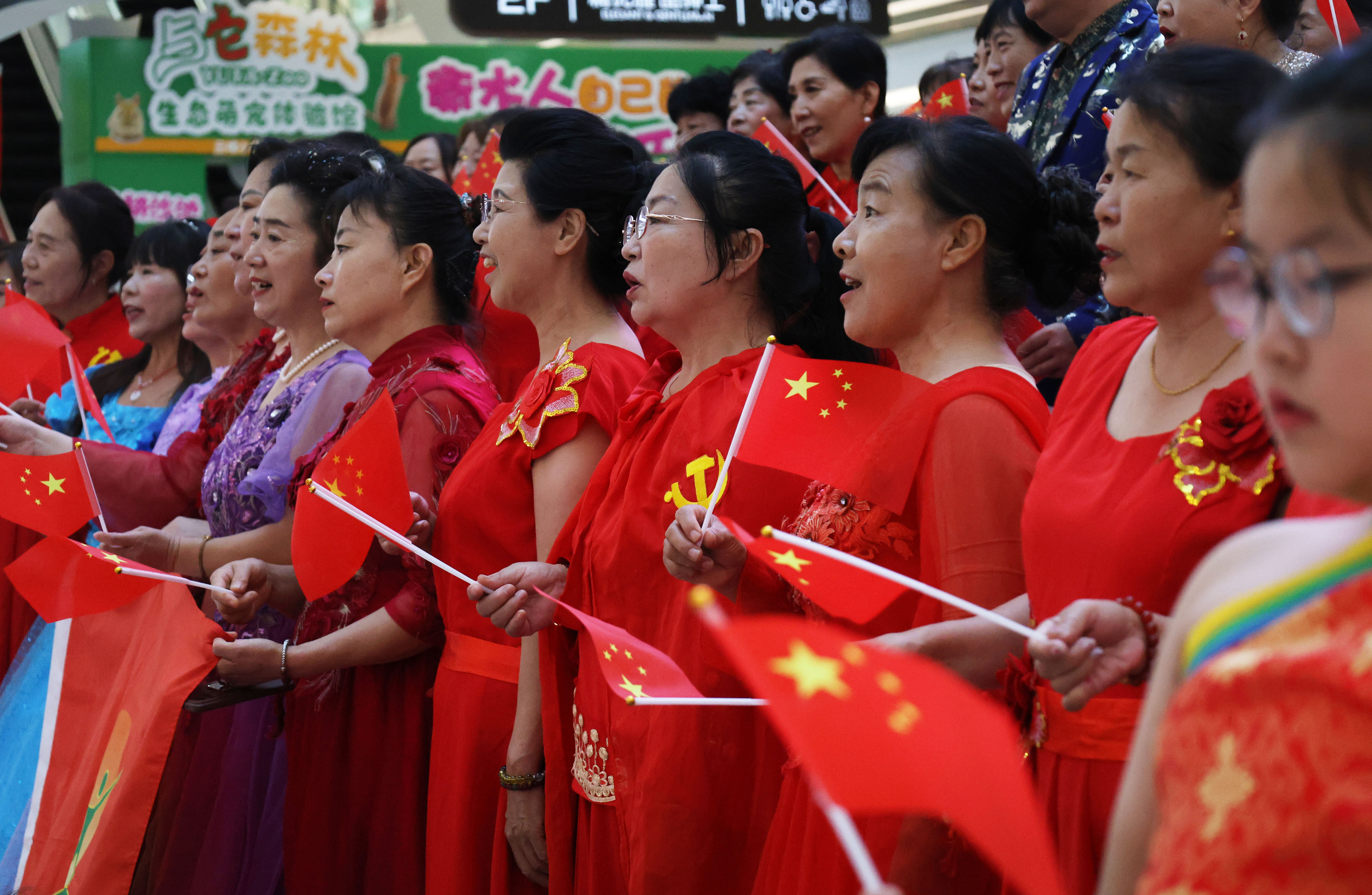 百余名身着红色服装、手持红色国旗的志愿者们,以饱满的热情唱响多首爱国歌曲。《歌唱祖国》的激昂旋律拉开了演出的帷幕,“五星红旗迎风飘扬,胜利歌声多么响亮……”歌声嘹亮,振奋人心。紧接着,《我和我的祖国》《没有共产党就没有新中国》两首大合唱,更是将现场气氛推向高潮。