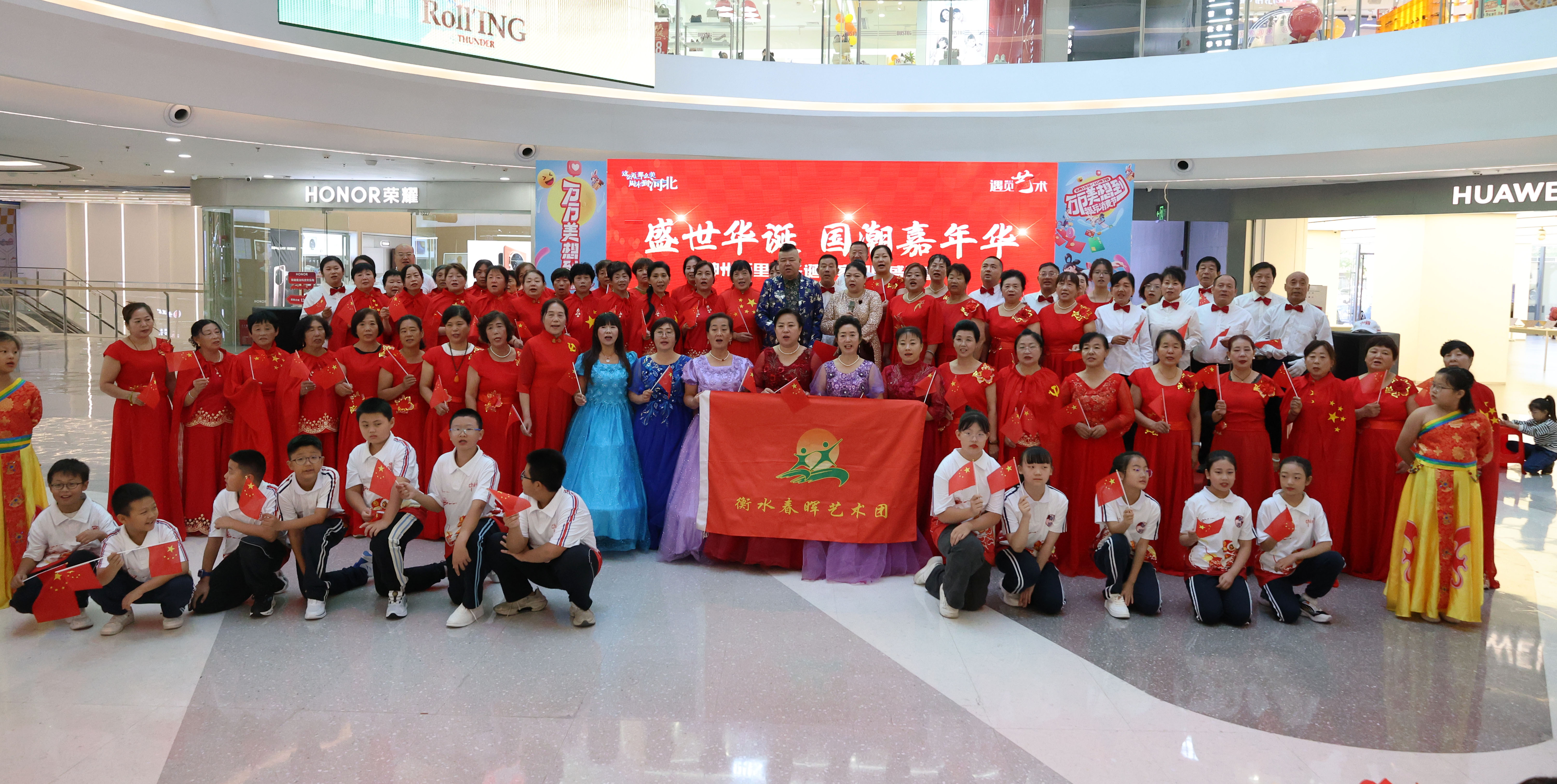 10月1日,由桃城区文化和旅游局、衡水市春晖义工协会艺术团主办的“盛世华诞 国潮嘉年华”百人合唱爱国歌曲贺国庆活动在衡水市区万达广精彩上演。