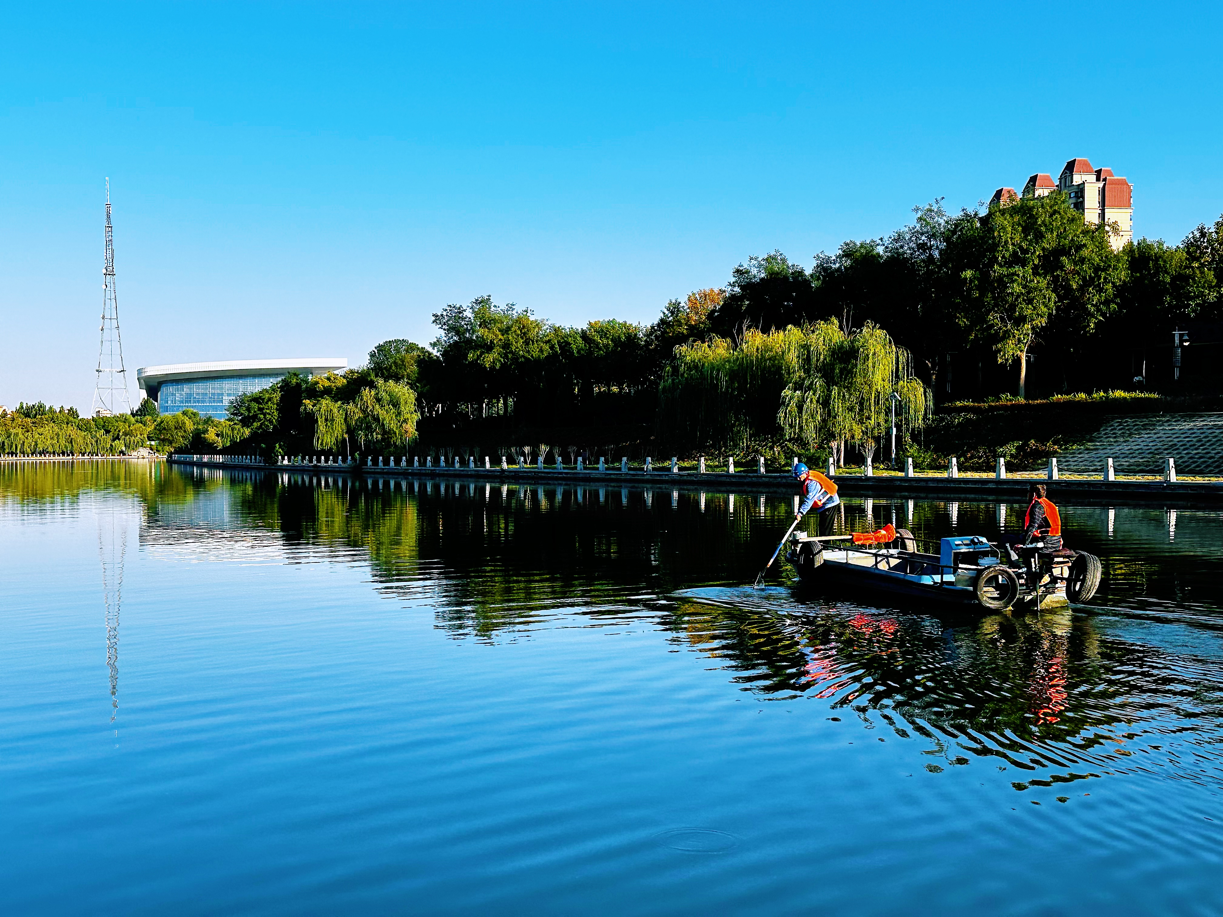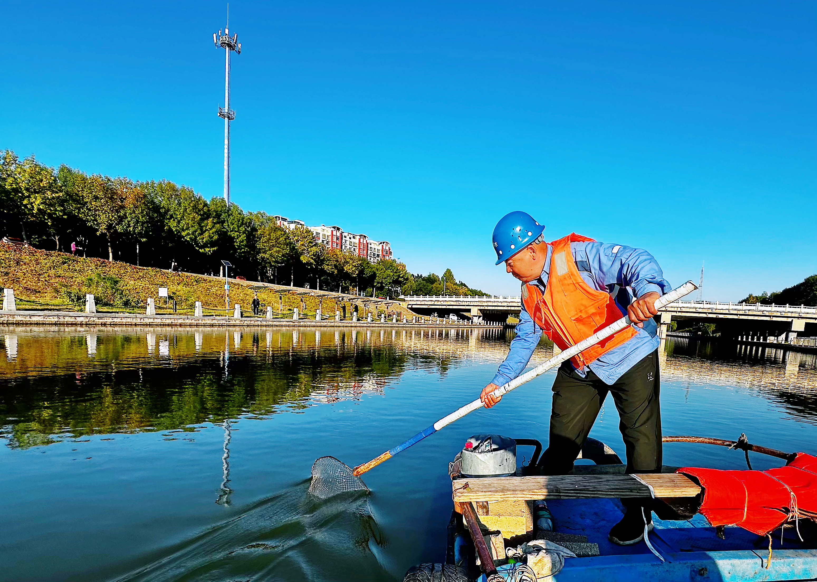 国庆假期,滏阳河市区段河道内,工人们驾船打捞、清理水面漂浮物、水草等,以辛勤劳动付出维护着环境的美好。