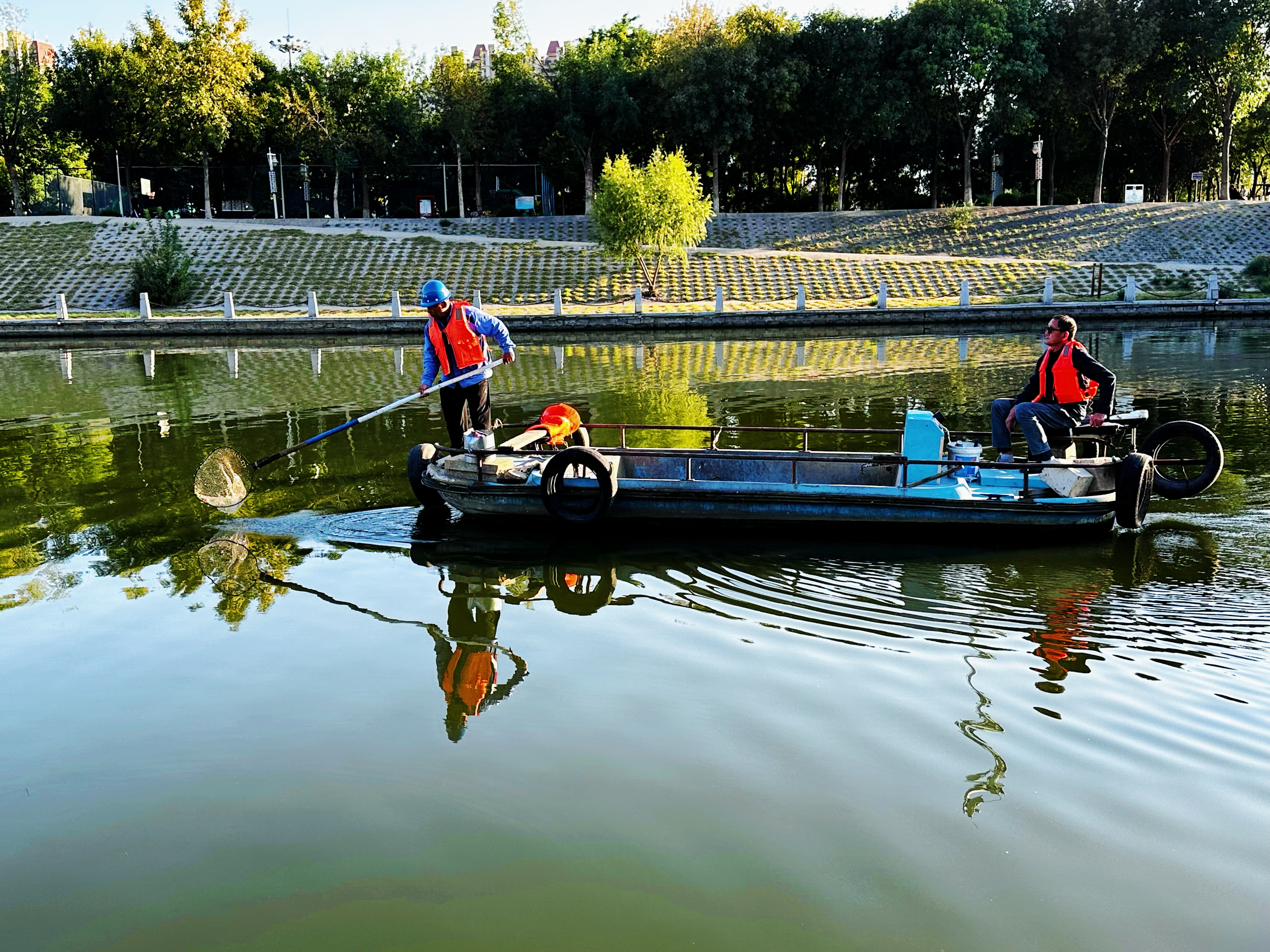 沿着滏阳河市区段走一走,清溪环绕,清新的空气扑面而来。滏阳河水域中的杂物和漂浮物也消失不见,清澈的水面倒映着蓝天白云,美不胜收。很多市民和家人在河岸边游玩,或拍照,或嬉笑,享受着悠闲的假期生活。“假期就要给市民最好的游玩体验,一定要让大家看到最清澈整洁的水面。”南金华边说边往河道驶去,双手不停地挥动着长长的打捞网,熟练地把水草和垃圾一一打捞至船舱,不放过河面上任何一个角落。经过四个小时的工作,此时保洁船舱上已堆有不少垃圾,包括树叶、塑料袋、水草、饮料瓶等。为了滏阳河的这份美景,市城管局滏阳河风景区管理中心的工作人员付出了辛勤的劳动。