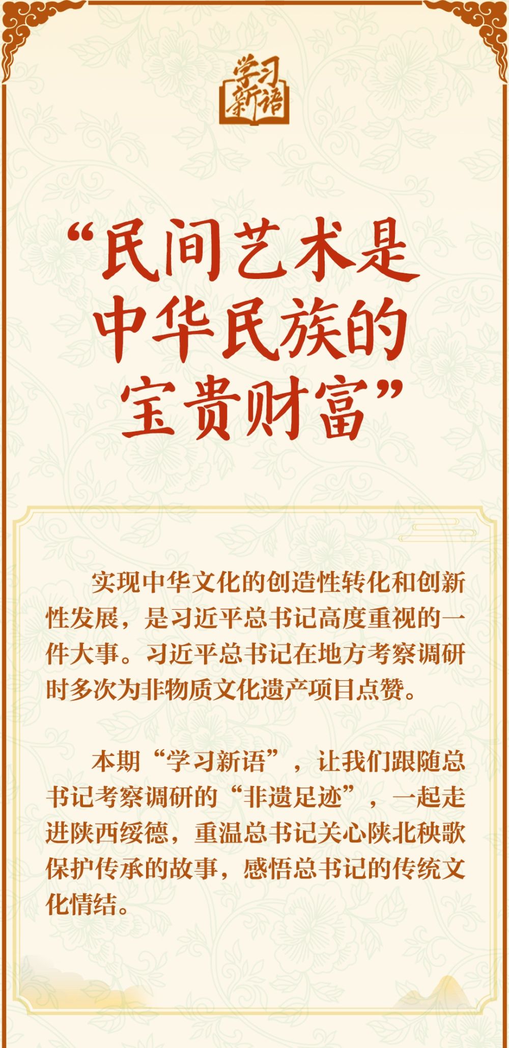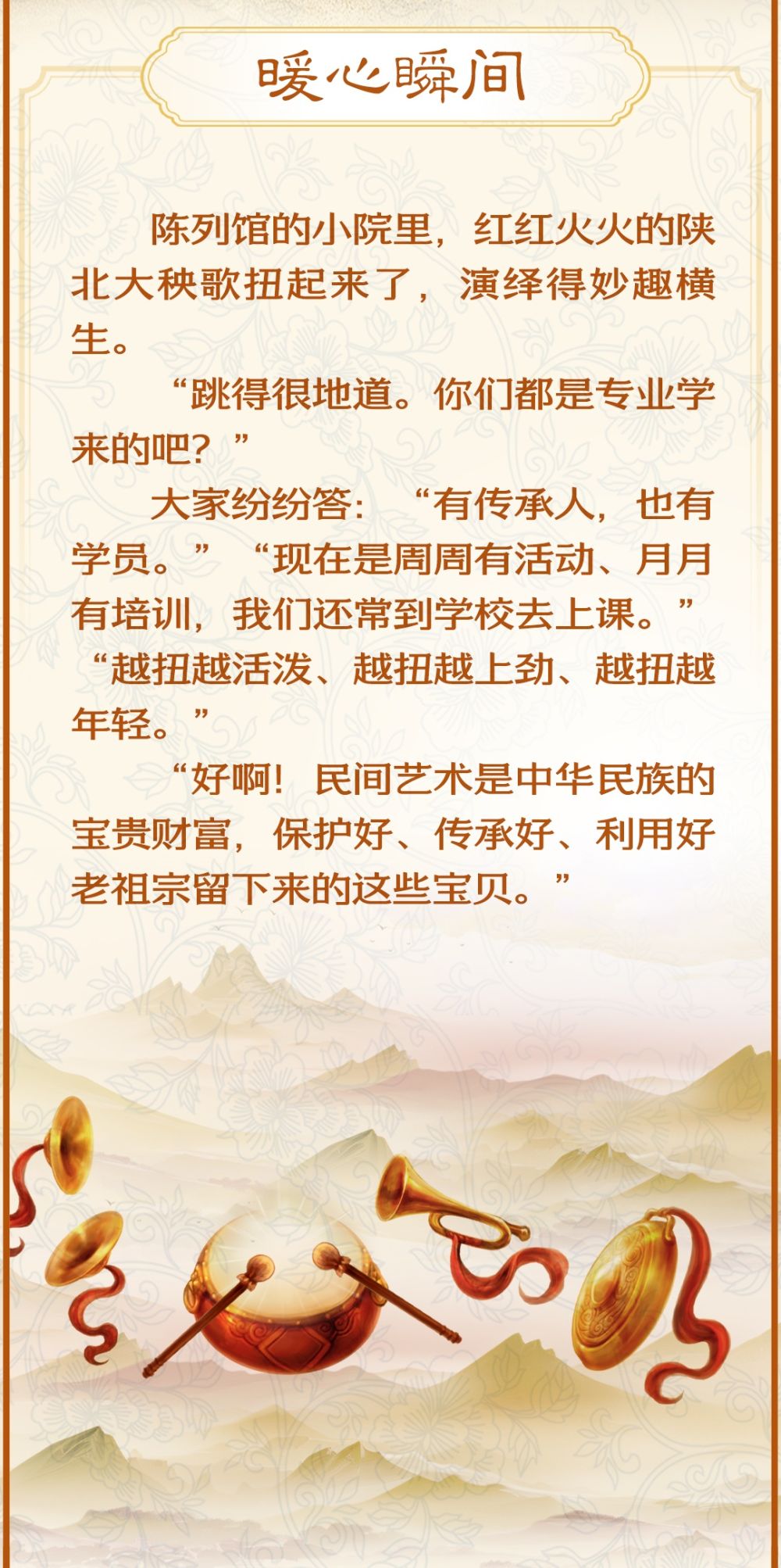 来源:新华社编辑:贾扬阳 来源:新华社 原标题:学习新语·非遗|“民间艺术是中华民族的宝贵财富” 点赞 +1 微博 微信 我要评论 发布 相关推荐 凝结团结力量 共筑民族未来——衡水市职业技术教育中心(桃城技工学校)开展“加强铸牢中华民族共同体意识教育”主题活动 激情校园 2025-03-31 学习新语·非遗丨“非物质文化遗产,中华民族的手艺活,既传统又时尚” 要闻 2024-10-06 【央视快评】把中华民族共同体意识牢记心间、融入血液 要闻 2024-09-26 【每日一习话】继承发扬民族民间文学艺术传统 要闻 2023-06-27 热门 一天 三天 一周 1 衡水“中国航天 衡水懂你”航天系列展览暨“万人共绘航天梦”活动启幕 2 衡水市灵活就业人员公积金开户人数突破5万人 3 书香飘万家 真情暖童心 饶阳县妇联开展世界读书日主题阅读活动 4 严查欠薪隐患 筑牢维权防线 衡水桃城区全力守护农民工“钱袋子” 5 衡水枣强县张秀屯镇:“白+黑”攻坚“一喷三防” 筑牢夏粮丰收屏障 6 衡水:社保宣传掀热潮 民生保障更贴心 7 衡水市第十二中学“智享书屋”启用 桃城区首座校园智慧阅读空间落地 8 暖“新”更暖心! 武强县委社会工作部为外卖骑手送上免费健康体检 9 冀州区开展“小手拉大手·文明齐步走”文明实践活动 10 雄安新区依托智慧城市提升现代化治理能力丨智慧城市有颗“超级大脑” 1 【四中全会精神在基层】“种苗工厂”里的现代化答卷 ——探访冀州区“育繁推一体化”种苗数智工厂 2 快来报名,全国青少年国防素养大赛(河北综合赛区)选拔赛来了 3 河北衡水:中国航天 衡水懂你——衡水市航天系列展览启幕 4 让“最柔软群体”享受“最优质照护”—— 衡水市故城县普惠托育服务实现从“有”向“优” 5 赶大集、看大戏!衡水市春季“村晚”走进阜城县霞口镇刘老人村 6 四金、四银、七铜 衡水小将闪耀省运动会冬季项目 创历史最佳战绩 7 衡水市开展第57个“世界地球日”垃圾分类主题宣传活动 8 守好民生“转运线” 做好群众“贴心人” —衡水优护送打造规范专业非急救转运标杆 9 共青团桃城区委开展世界读书日主题实践活动 10 “奔跑吧·少年”2026年衡水市青少年田径比赛暨河北省青少年田径锦标赛达标赛开赛 1 衡水市冀州区开展“阅见书香之美 共筑阅读之城”春季书香节主题活动 2 衡水文旅“春意浓”:多元产品激活春日市场 3 河北故城:启动“护苗·绿书签”行动 书香校园里播撒“绿色”种子 4 4起整治形式主义为基层减负典型问题,公开通报! 5 【四中全会精神在基层】“种苗工厂”里的现代化答卷 ——探访冀州区“育繁推一体化”种苗数智工厂 6 【新思想引领新征程】推进数字中国建设 打造高质量发展新引擎 7 衡水市2026年新时代乡村阅读启动仪式在武邑举办 书香赋能乡村振兴 8 快来报名,全国青少年国防素养大赛(河北综合赛区)选拔赛来了 9 阜城县6万余亩西瓜喜获丰收 科技赋能助农增收 10 3月份衡水城市CPI同比上涨2.0% 广告 广告 广告 24小时 1 衡水市工人文化宫举办《论语》主题读书分享会 2 衡水市城管局排水管理中心开展“边沟清淤”疏通专项行动 3 书承文脉 阅见湖城 4 衡水桃城区:让群众在家门口享受省级医疗服务 5 安平县多部门联合开展世界读书日主题活动 6 中国人寿安平支公司积极开展防范非法集资户外宣传活动 7 大家人寿衡水中支:金融知识进田园 守护权益暖民心 8 学习手记|守护好这颗蓝色星球 9 微视频|习近平的读书之道 10 习近平向伊拉克新任总统阿米迪致贺电