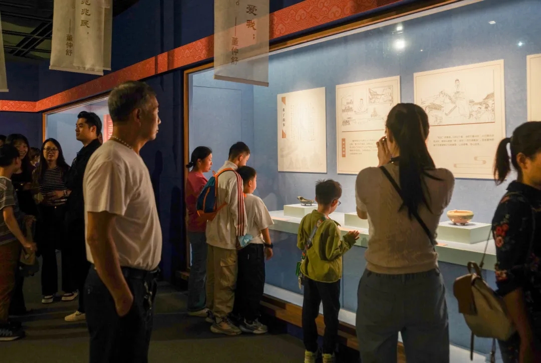 展厅内,来自两馆的汉代文物以及与董仲舒相关的文史资料、工艺制品,后人为纪念董仲舒所作的画作等,融汇古今,系统讲述董子生平、贡献,全面解读儒学文化,生动展示相关遗迹、遗存、遗风以及儒学文化创新成果。游客们慕名走进展厅,深入了解董仲舒的生平故事,从中汲取传统文化的养分。