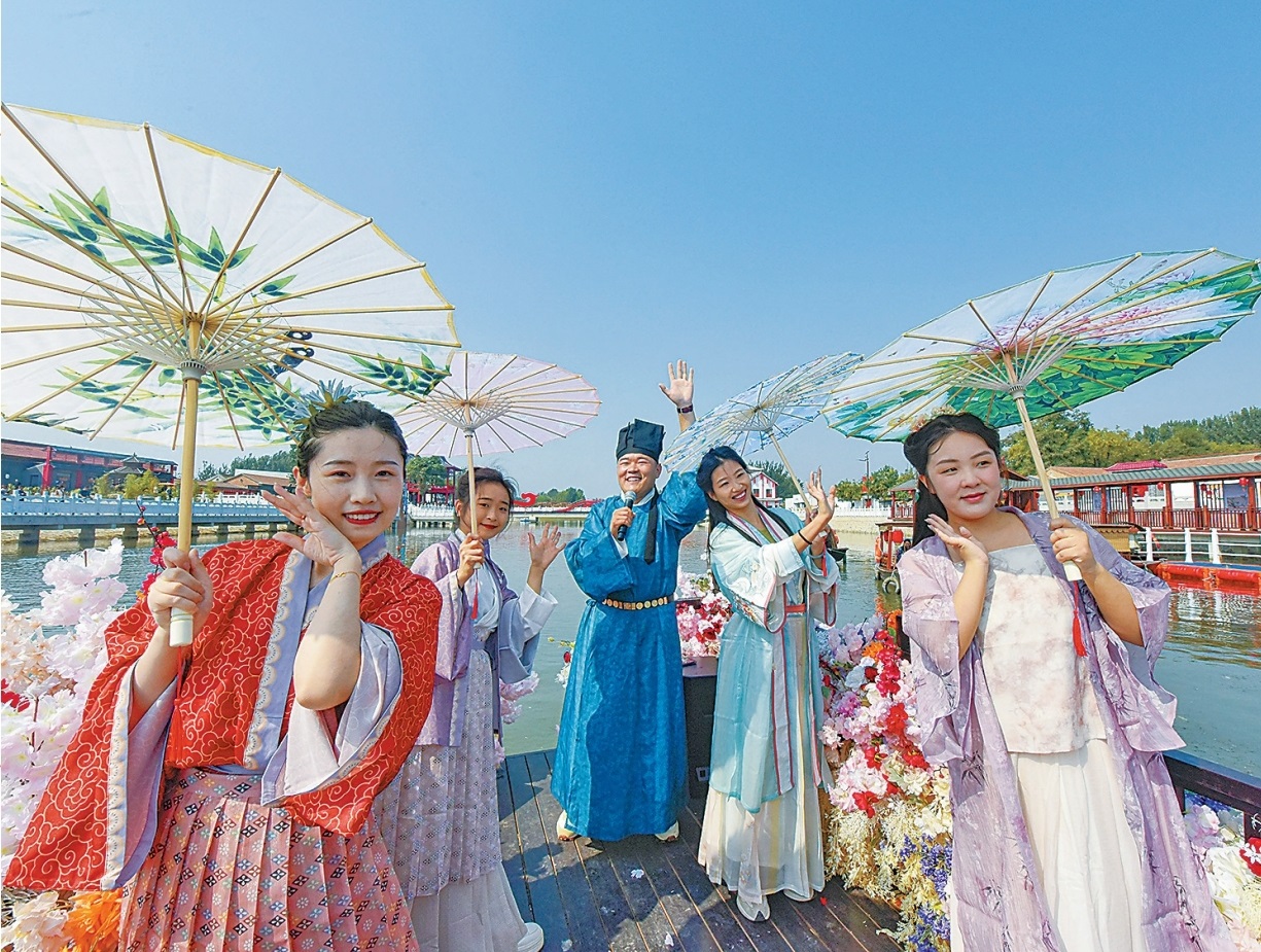 翩若惊鸿的仕女、琳琅满目的美食、锣鼓喧天的戏楼、热闹繁华的市井……国庆期间,位于广阳区万庄镇的“齐家营宋风潮玩街区”人头攒动,人们或漫步观览,或乘舟泛游,仿佛一秒穿越到古代,沉浸式体验一把“宋朝人”的生活。 “宋风潮玩齐家营”沿龙河蜿蜒而建,长7.5公里,主要包含“齐家营宋风潮玩街区”和“龙河宋韵·潮玩雅集露营地”两大板块。自9月13日开放以来,景区吸引了京津冀及周边众多游客前来打卡游玩。 “宋风潮玩齐家营”的火热,依托的是龙河的良好生态环境和廊坊的深厚历史文化。2021年起,广阳区对龙河流域广阳段开展综合治理与生态修复。在此基础上,广阳积极谋划建设“龙河宋韵·生态文化公园”,先期投用一期项目“宋风潮玩齐家营”,努力把龙河建成水绿岸美、人聚业兴的生态文化产业带。