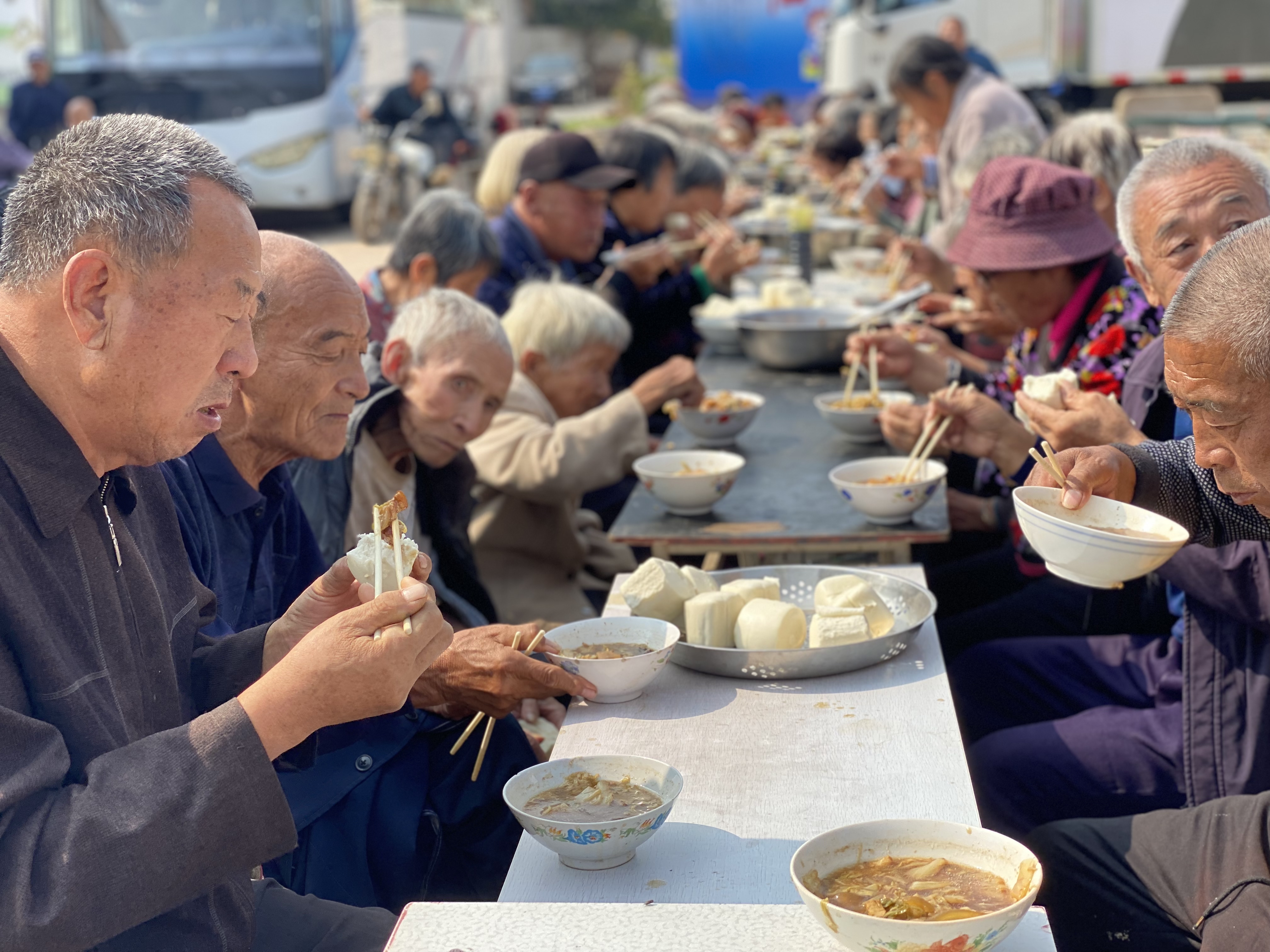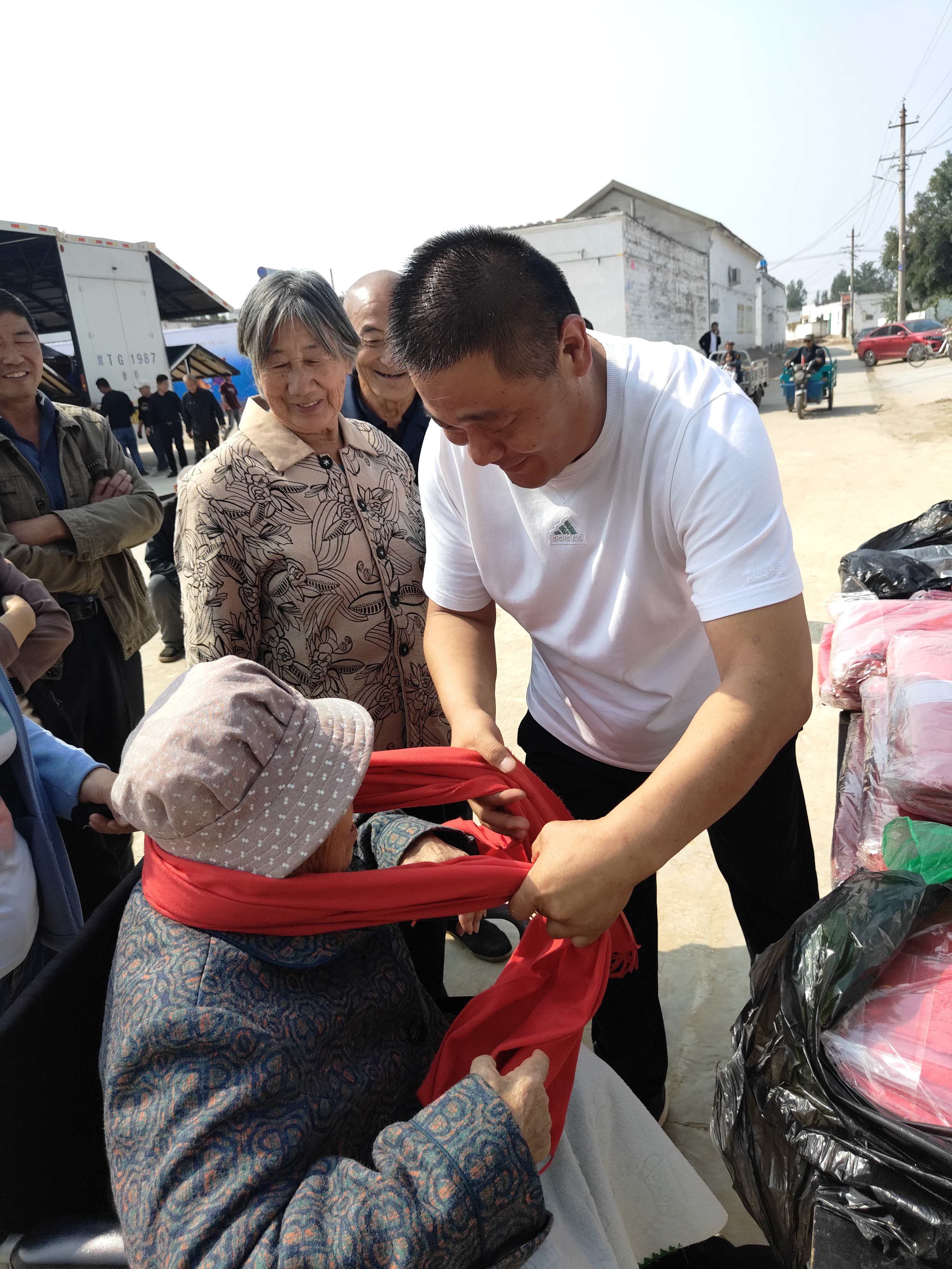 歌舞看罢,临近中午,村里的爱心午餐也很快开席了。北梨园村的老人们围坐在一处,闲话家长里短,村里的中青年人齐上阵,烧菜、装盘、端菜。浓浓的菜香夹裹着邻里亲情,以及深深敬老情在餐桌前弥漫。高古庄镇相关领导和北梨园村党支部书记还为该村70周岁以上的老人们发放了红围巾和红袜子,并向他们送上最真诚的祝福。