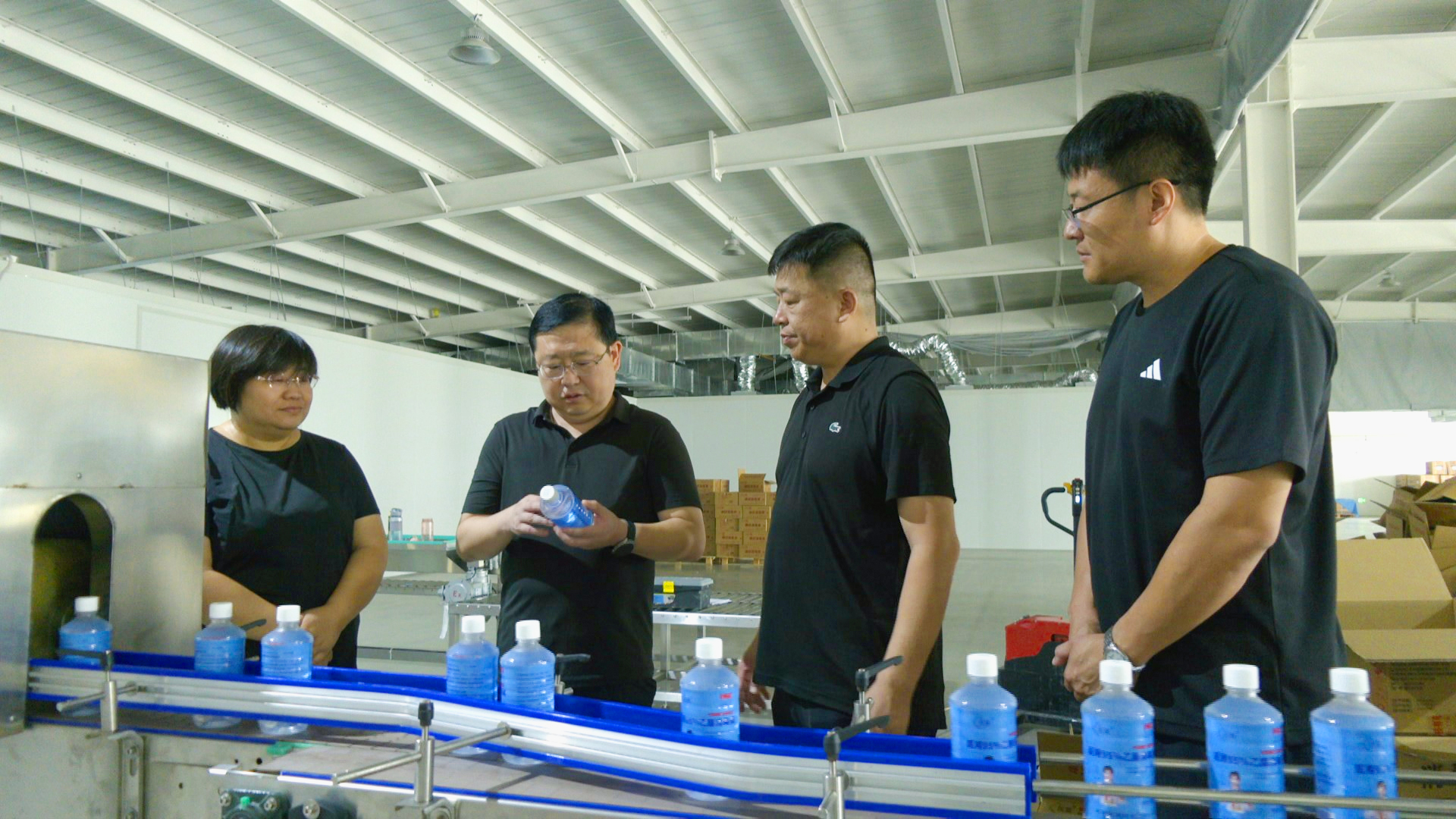 枣强镇工作人员在中实德天(北京)医疗用品有限公司参观消毒水生产线。 张宁宁 摄