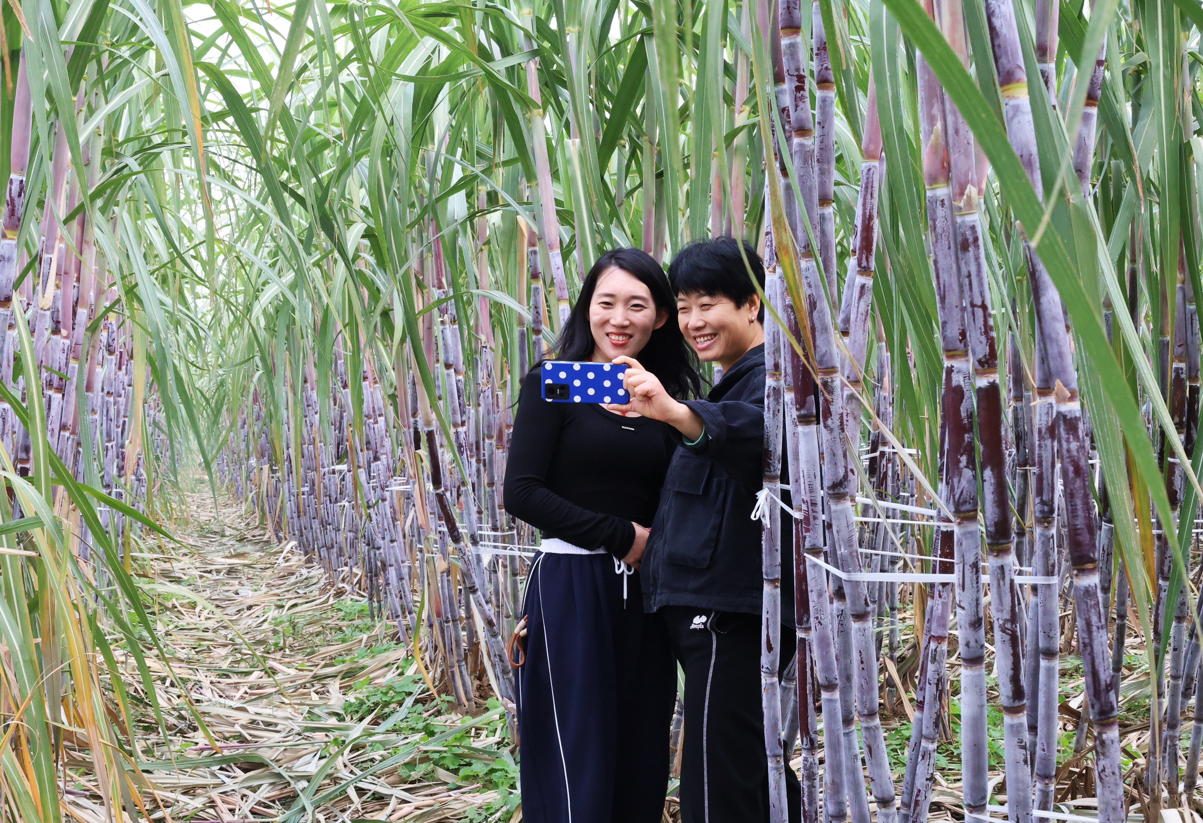 游客在甘蔗林里拍照。