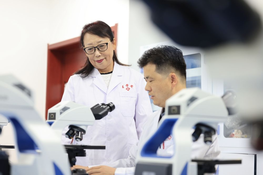 崔丽在辅导青年教师观察组织切片标本。(方卫东 摄)