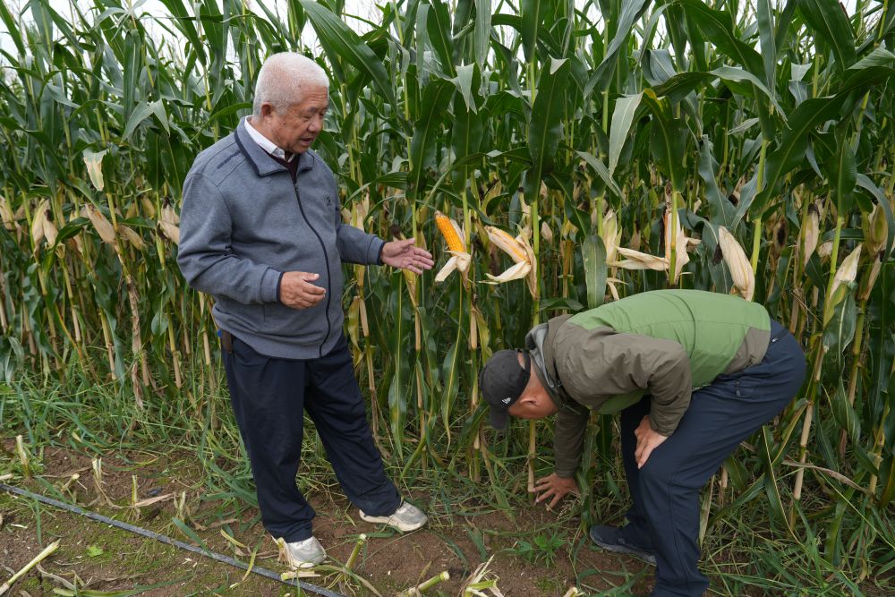 9月底,宁夏吴忠市利通区金积镇梨花桥村,一片片籽实饱满的青贮玉米挺立田间,大型收割机穿梭其中。66岁的农业技术专家杨生明剥开玉米棒苞叶,检查籽粒成熟情况,收完玉米,马上就要抢种冬小麦,他负责技术指导。