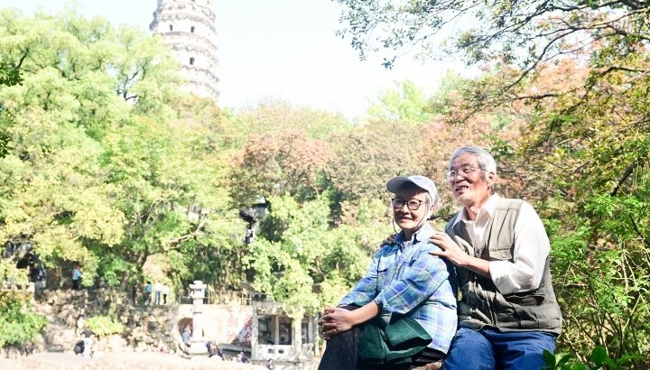 江苏苏州,老人们登虎丘山迎重阳