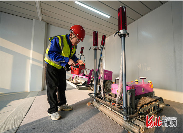 10月11日,在雄安国贸中心项目机器人展厅内,技术人员正在调试地面抹平机器人。 河北日报记者 李畅摄