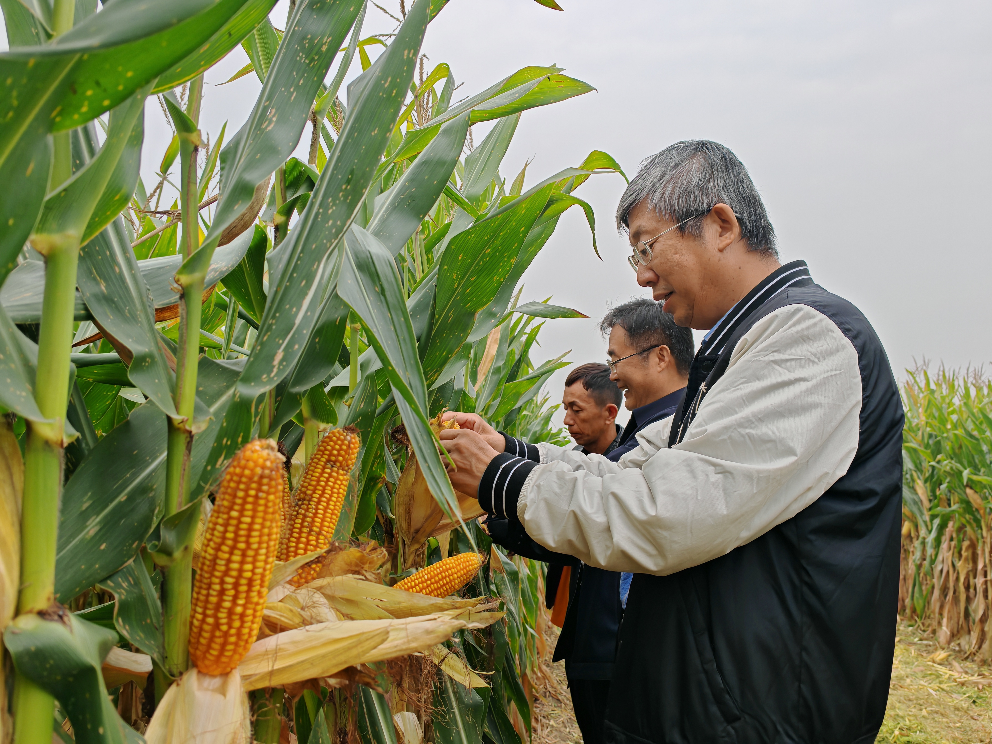农业专家现场查看玉米长势。 耿鹏华 摄