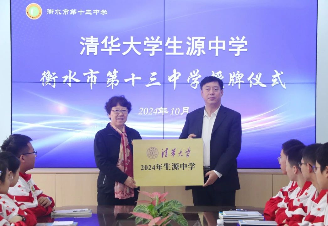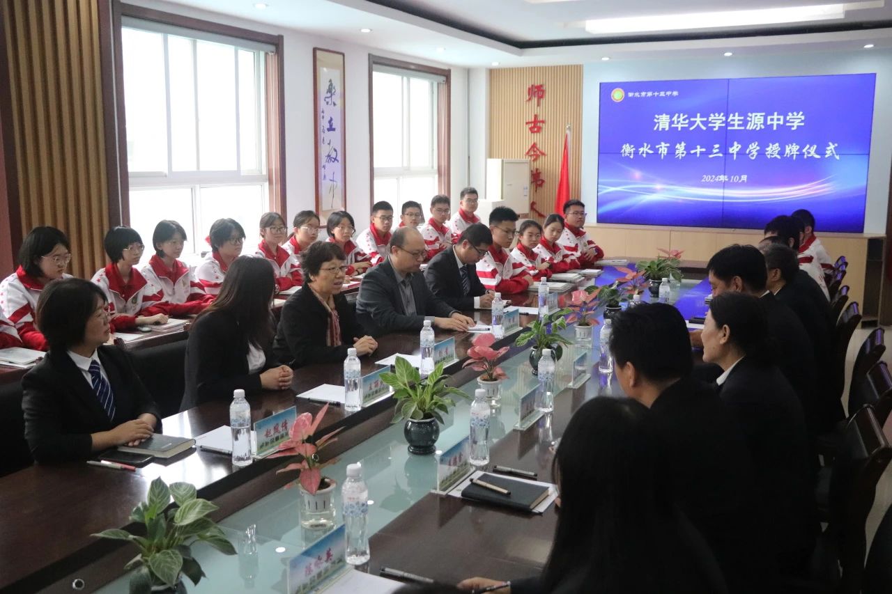 10月13日,清华大学河北招生组组长、能源动力系刘青教授,自动化系何潇教授莅临衡水十三中,授予十三中“2024年生源中学”荣誉称号,这是继2021年、2022年和2023年之后,清华大学第四年为十三中授牌。市教育局督学、衡水十三中党委书记白祥友,与领导班子成员及相关处室负责人接待了两位教授。