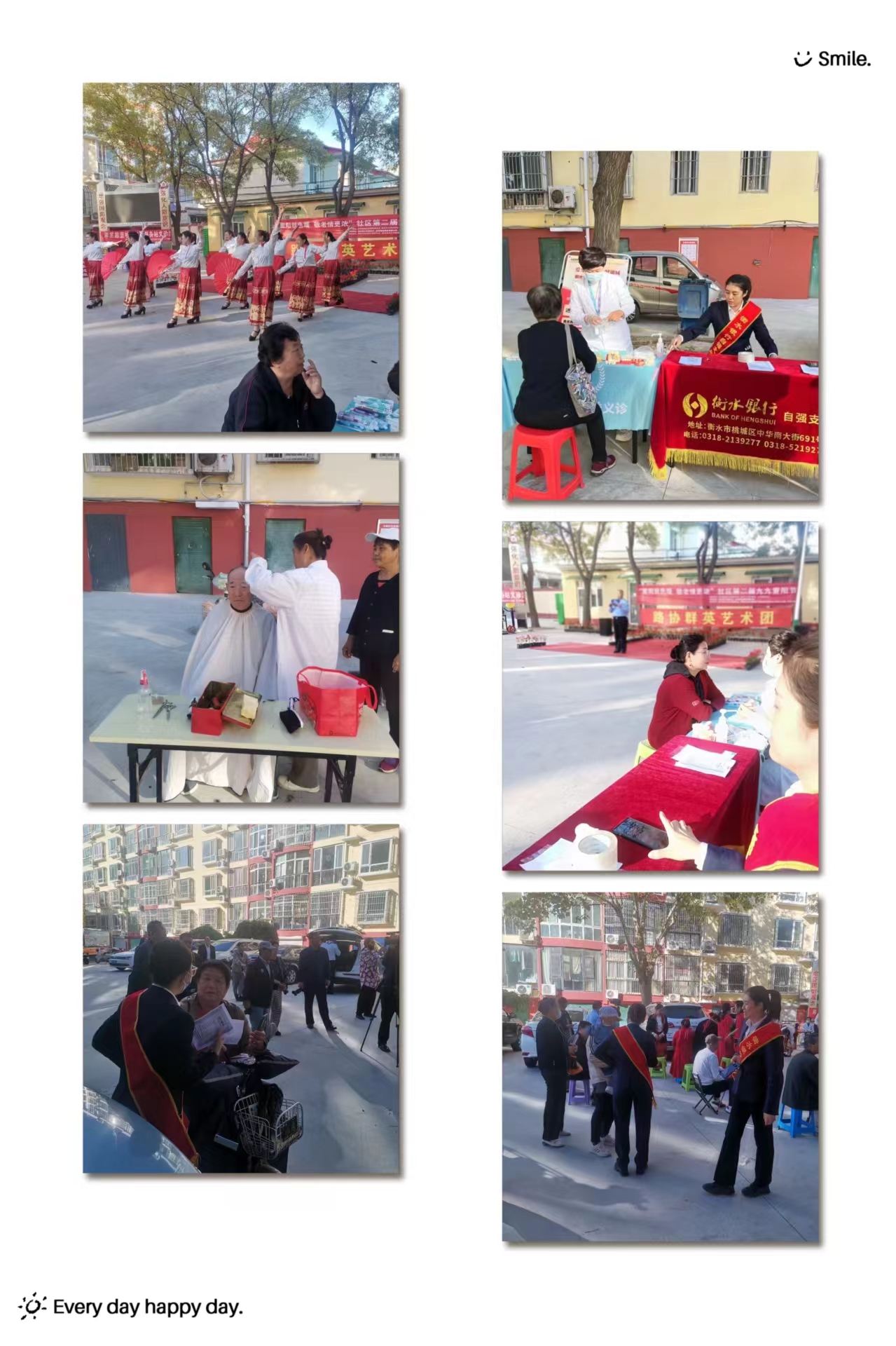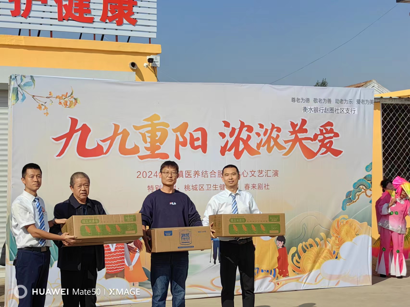 进行慰问走访。大庆路支行、河西支行举办“九九重阳节孝亲饺子宴”活动,近百余名老人看表演、吃饺子,节日氛围热闹非凡。带着米面油、长寿面等慰问品,赵圈社区支行工作人员来到赵圈镇义养中心,开展九九重阳节义演慰问活动,邀请赵圈春来剧社的20名义演志愿者,用舞蹈、歌曲、戏曲等一场精彩的文艺演出,向老年朋友们致以最诚挚的慰问和最深切的祝福。