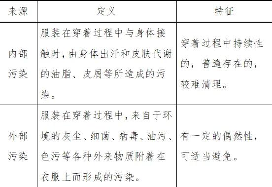 通常来说,根据污染物来源的不同,服装受到的污染通常可分为内部污染和外部污染。外套等服装在穿着过程中容易遭到外部污染,贴身内衣则主要是受到内部污染,夏季单衣则同时受到内部和外部污染。
