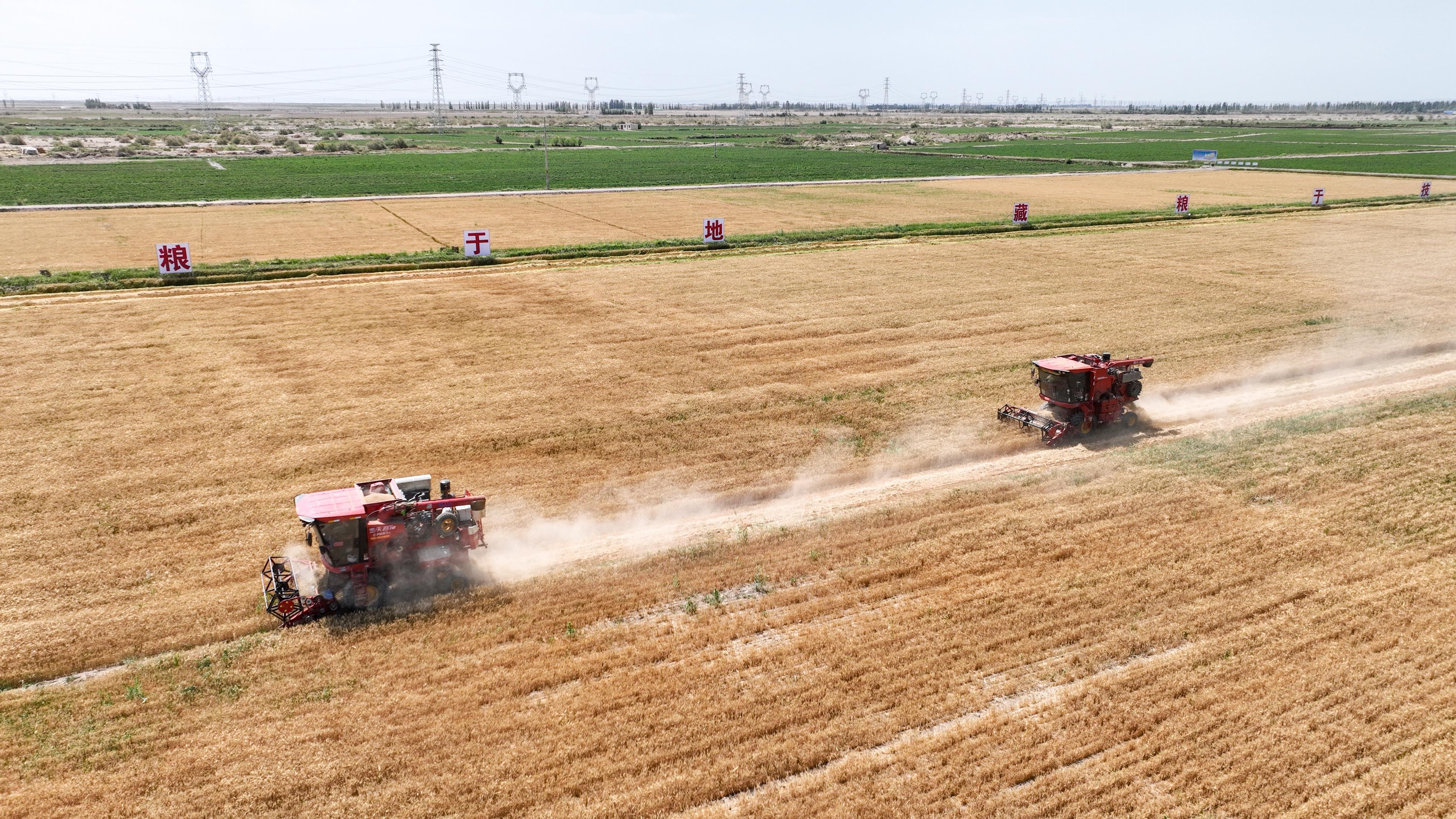 △2024年7月10日,在甘肃省酒泉市金塔县东坝镇小河口村中度盐碱耕地综合治理利用示范点,1000余亩盐碱地小麦喜获丰收。