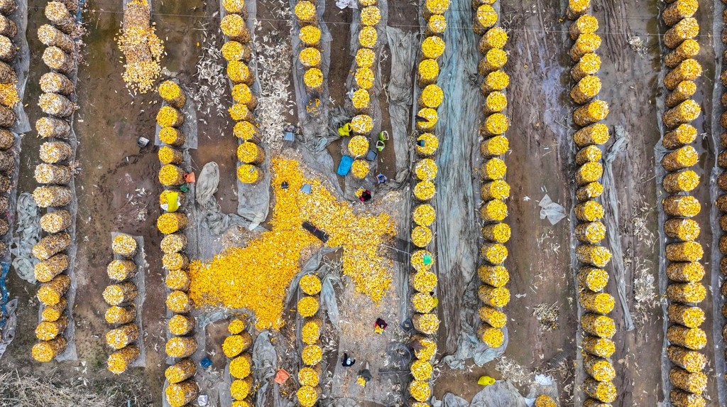 10月17日,河北省遵化市东新庄镇农民在场院将收获的玉米装入粮囤(无人机照片)。新华社发