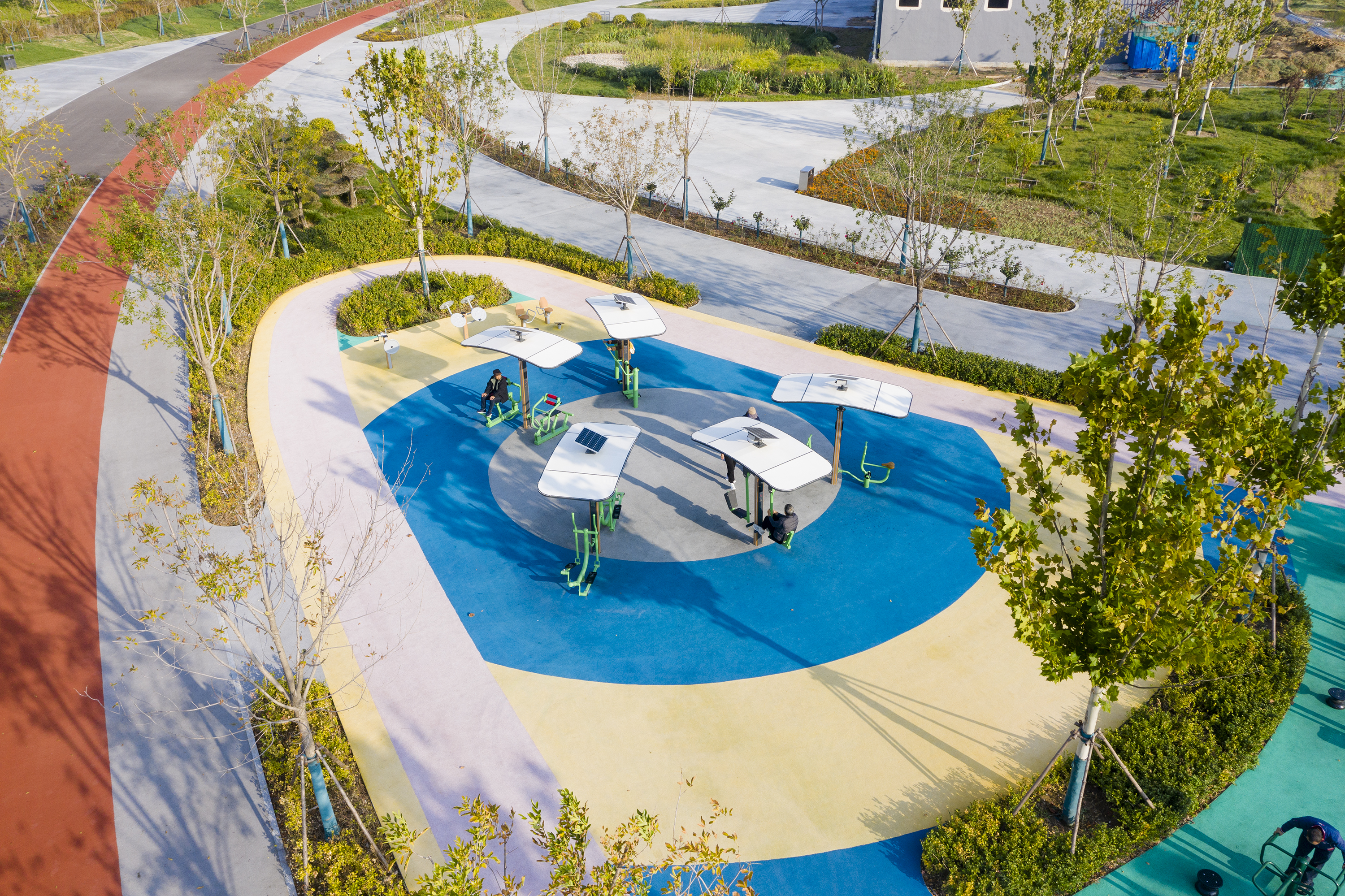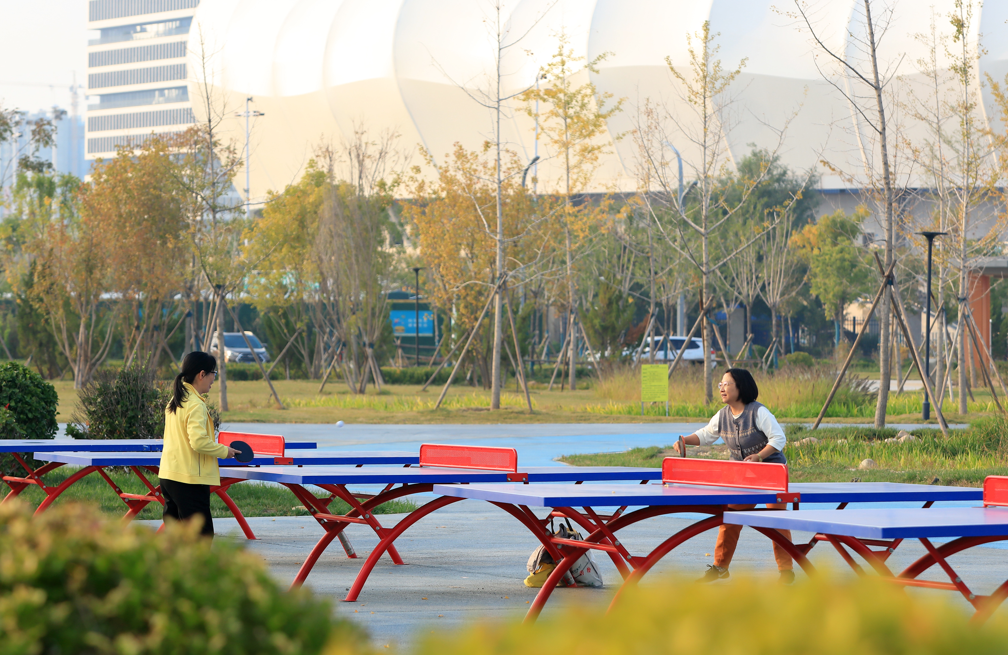 公园以全民健身为主,园内设有绿地休闲、健步、智慧运动、智能器械锻炼、儿童娱乐、初级轮滑等运动场地,进一步补齐全民健身场地设施的“短板”,充分激发全民运动热情,让休闲、健身、运动更具互动性。花廊下携手散步的夫妻闲谈着话语,乒乓球场上同伴你来我往攻防转换激烈,儿童娱乐设施上孩子的欢声清脆活泼……