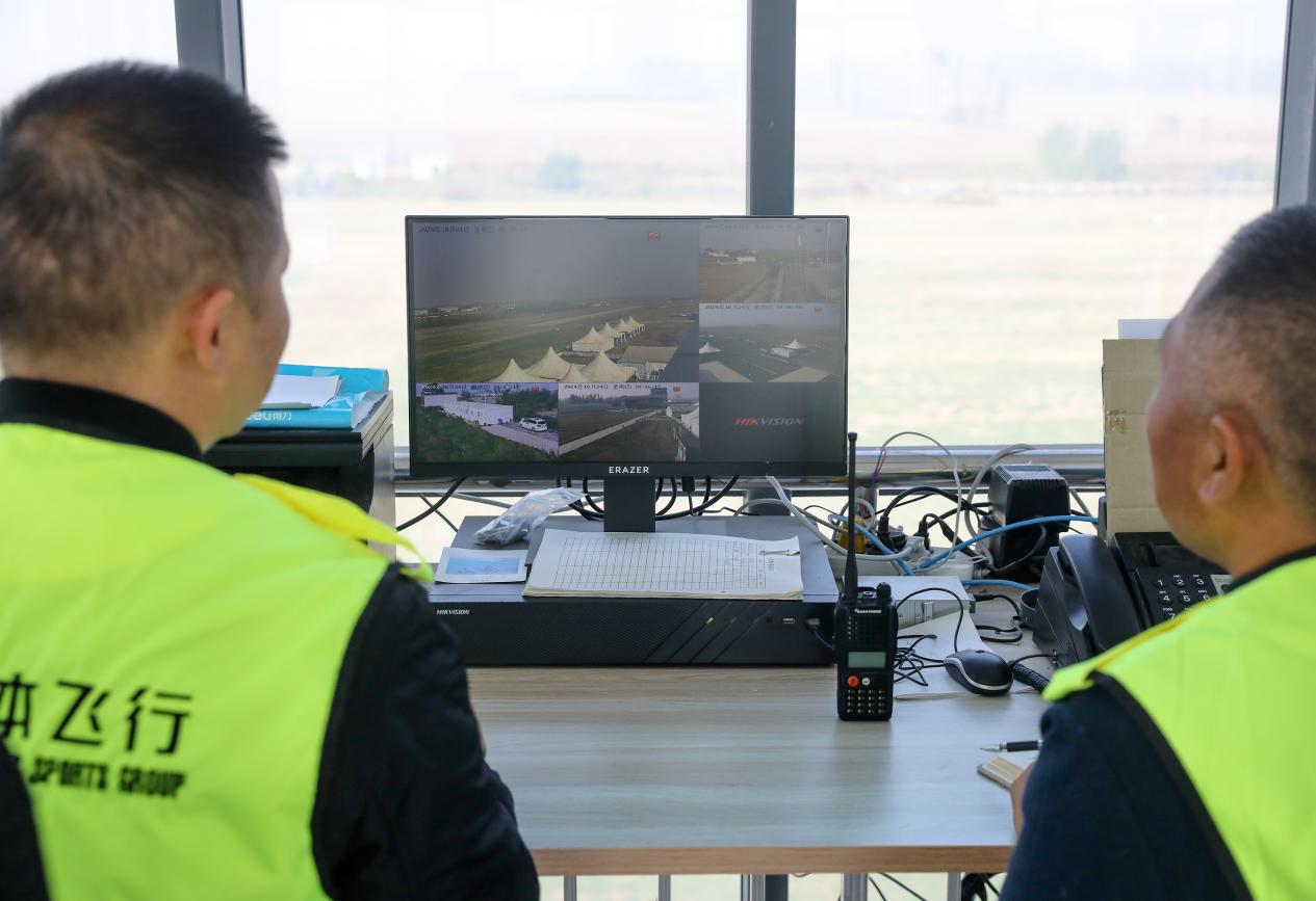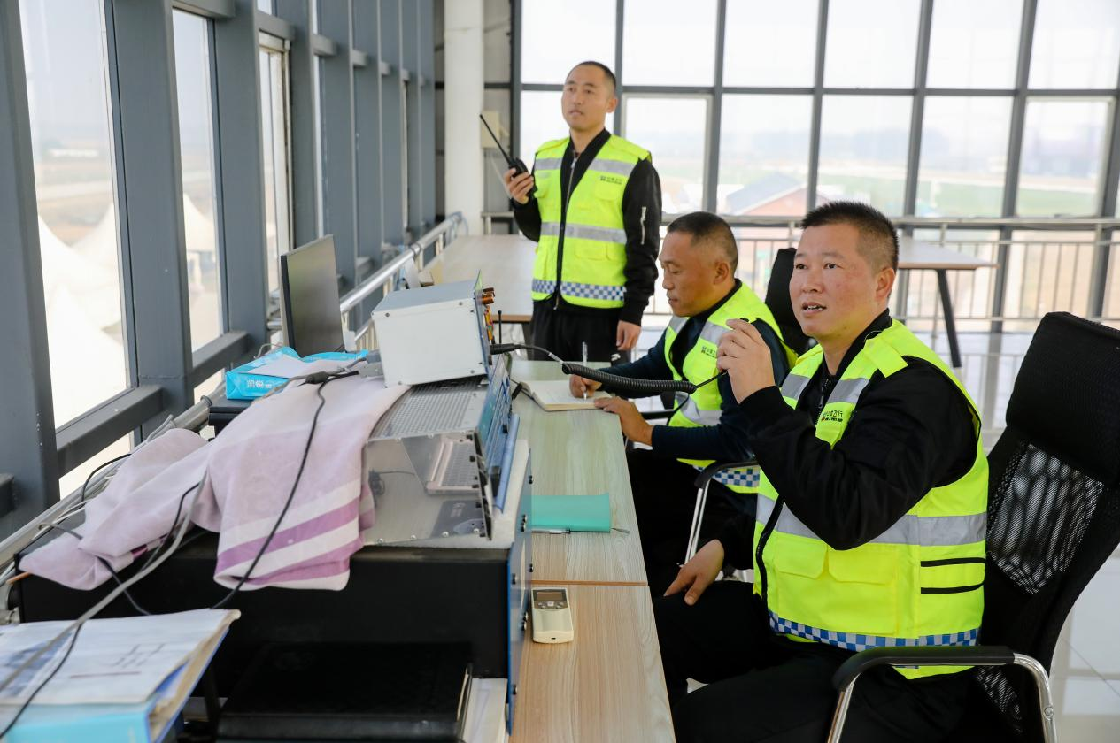 衡水桃城机场塔台指挥人员密切观察飞机起飞情况。陈康 摄