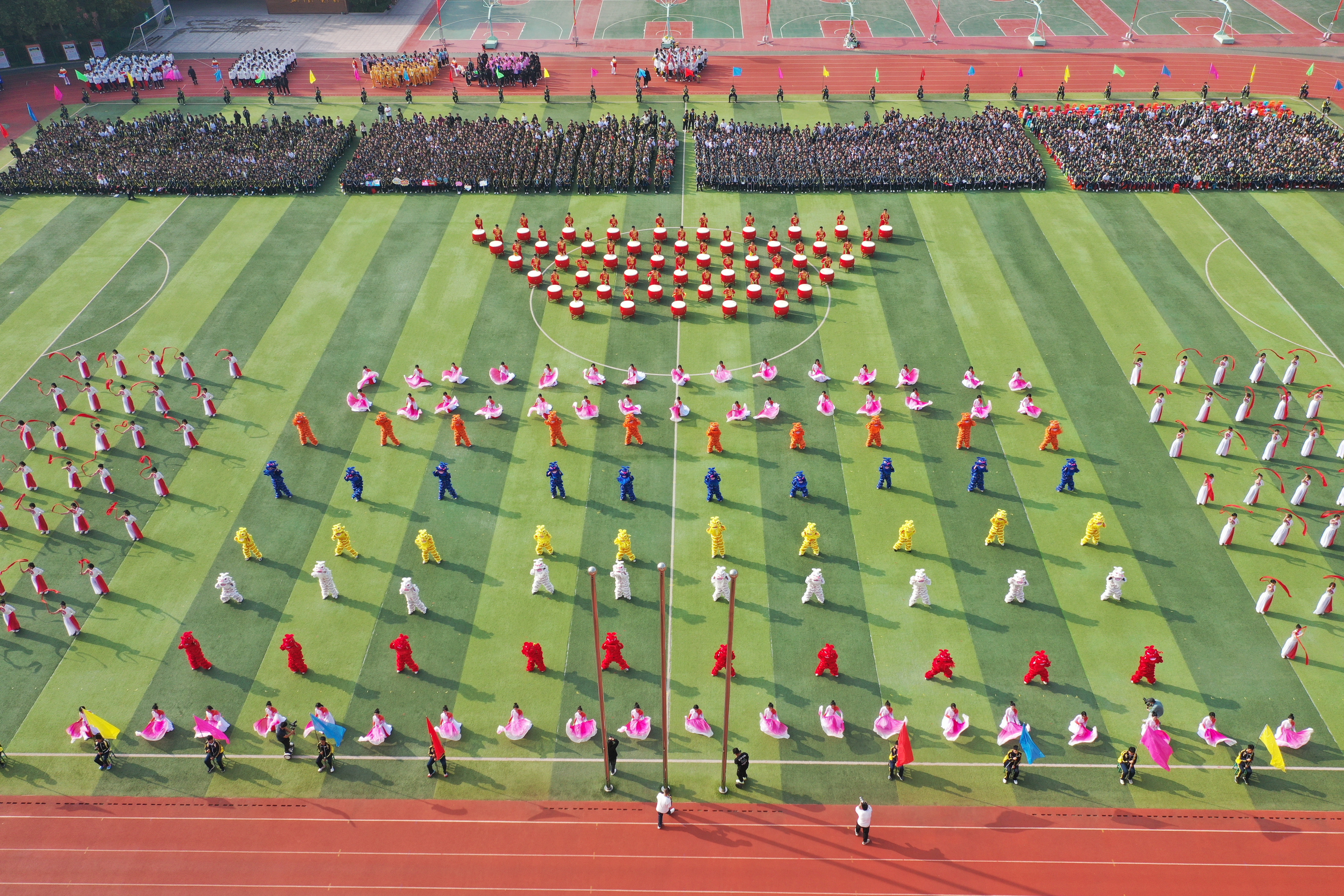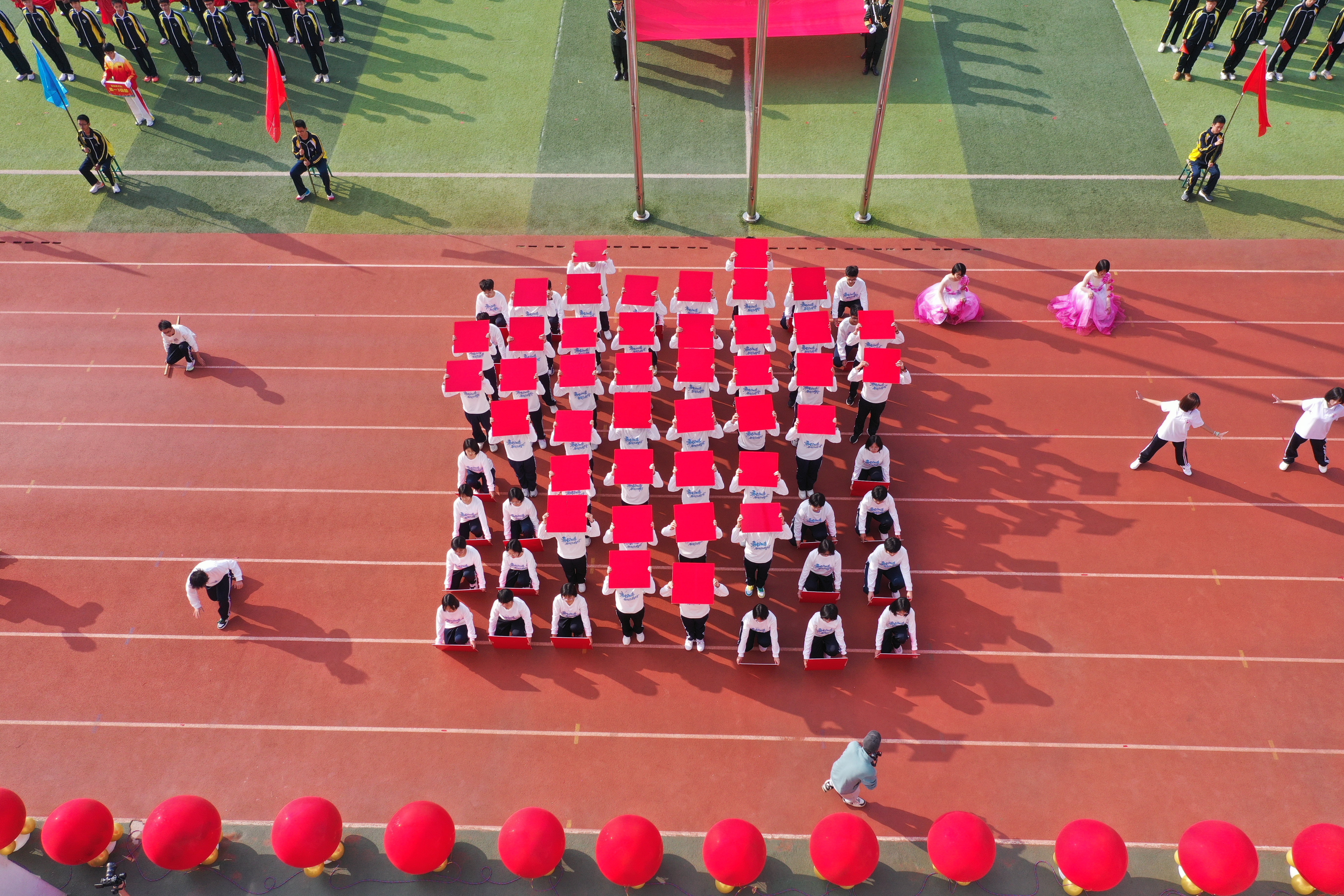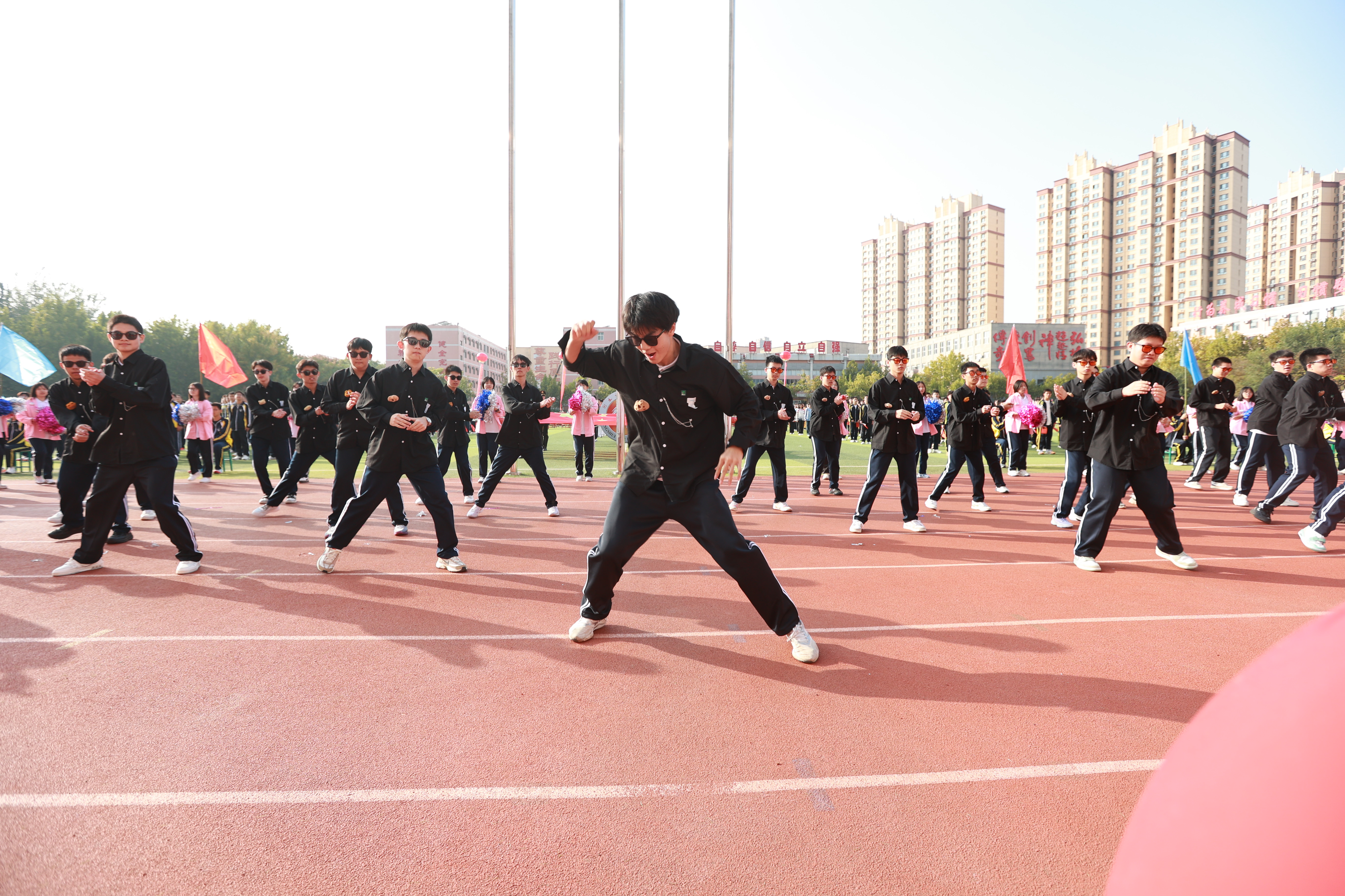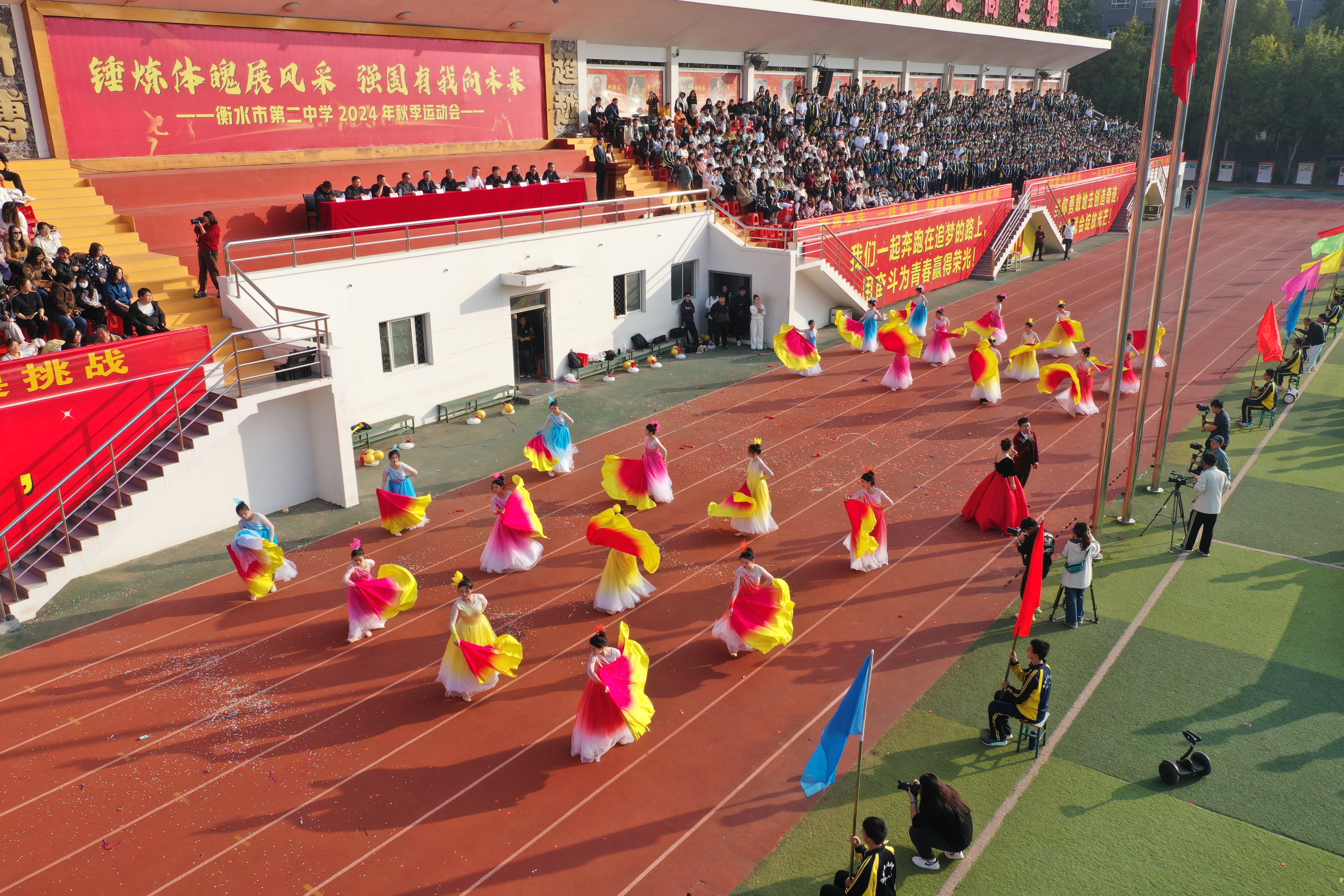 伊校长致辞结束后,宣布2024年衡水二中秋季运动会正式开幕,五彩缤纷的气球在操场上空“绽放”,雷鸣般的掌声响彻整个二中校园,同学们的壮志豪情也随之升腾。为庆祝这一激动人心的时刻,学校师生为大家呈现了一场精彩纷呈的歌舞表演《共圆中国梦》。师生们载歌载舞,把对祖国的祝福与热爱融入这场盛大的仪式中,充分展现了学校师生齐心协力、同心爱国的团结精神和炙热情怀。